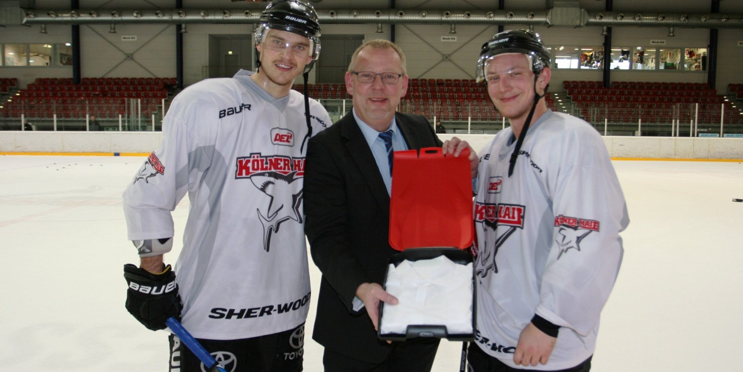 Die leichte, aber harte Plastikbox garantiert einen komfortablen Transport von Hemden. Miko-Hordijk lieferten die Shirtcases bei der offiziellen Übergabe durch Business Unit Manager Josef Vukmanic natürlich in den Haie-Farben aus.