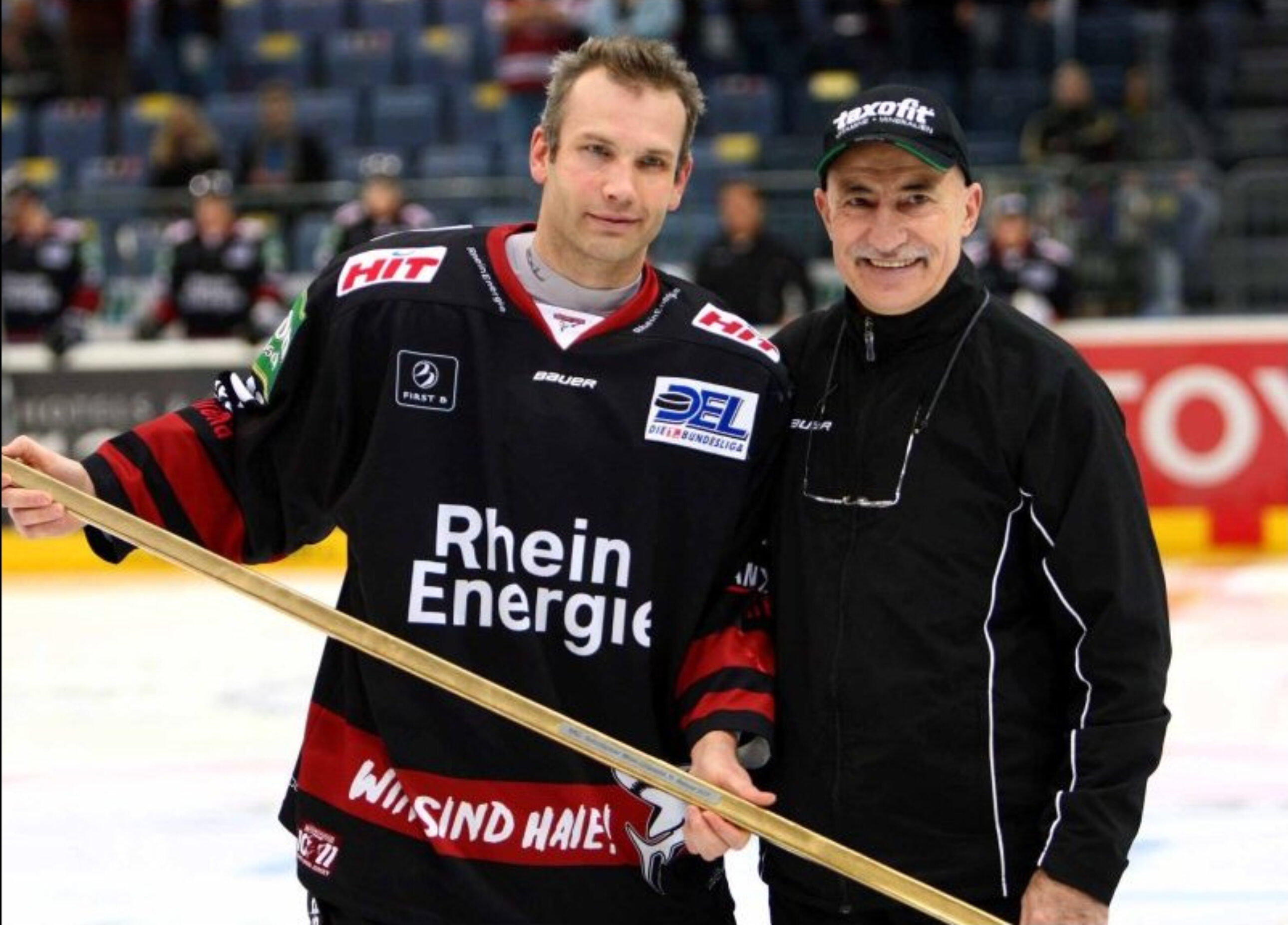 Sein Weggefährte über seine komplette Karriere, der langjährige Haie-Materialwart und KEC-Urgestein Lothar Zimmer, überreichte Lüdemann unter dem Applaus der Fans einen goldenen Schläger.