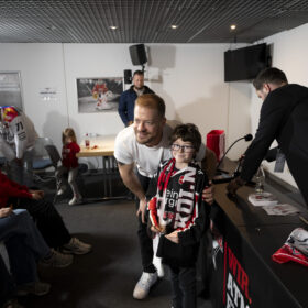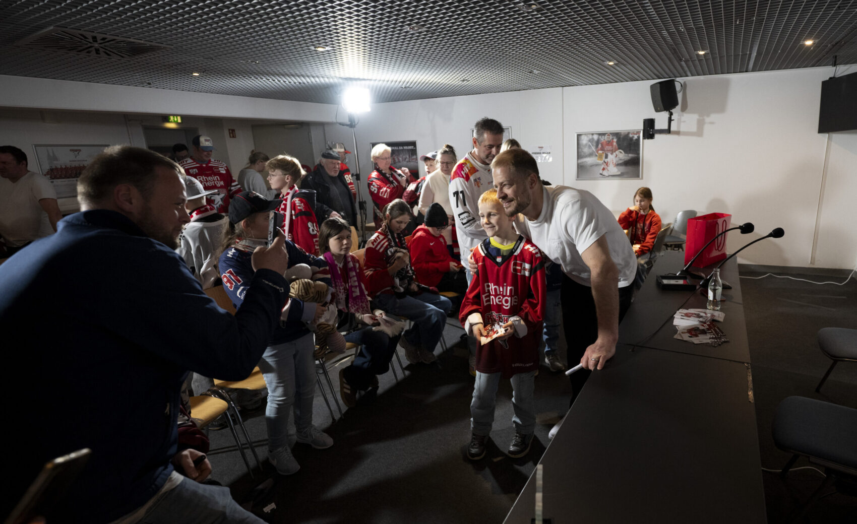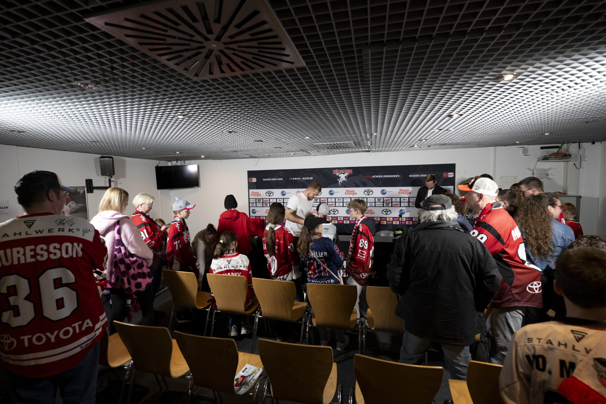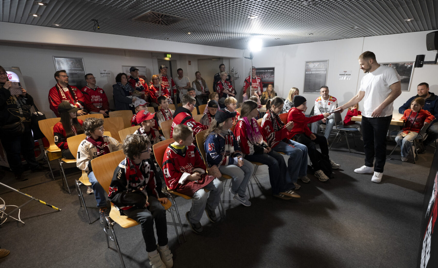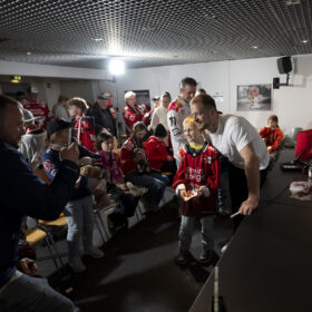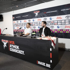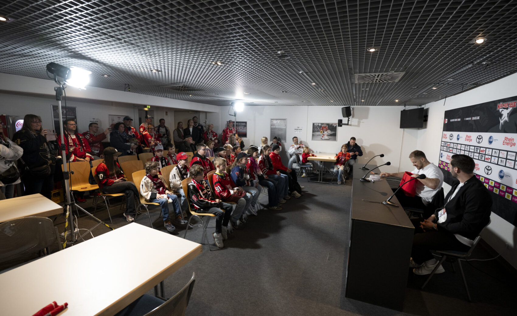 Im Anschluss an unser Heimspiel gegen die Eisbären Berlin (0:1) nahm sich unser Kapitän Moritz Müller in den Katakomben der LANXESS Arena Zeit für circa 20 Haie-Kids-Club-Mitglieder. Im Medienzentrum – also dort, wo normalerweise die Pressekonferenzen nach unseren Heimspielen stattfinden – beantwortete „Mo“ den Kids alle Fragen und stand zudem für Foto- und Autogrammwünsche zur Verfügung. Wir haben die besten Fotos des kurzweiligen Termins für euch zusammengestellt.