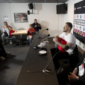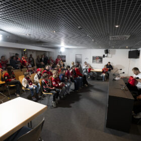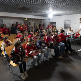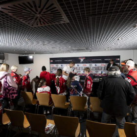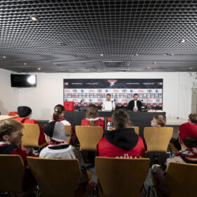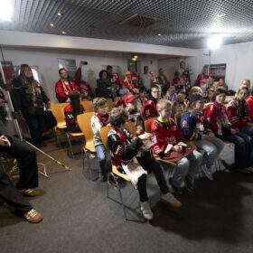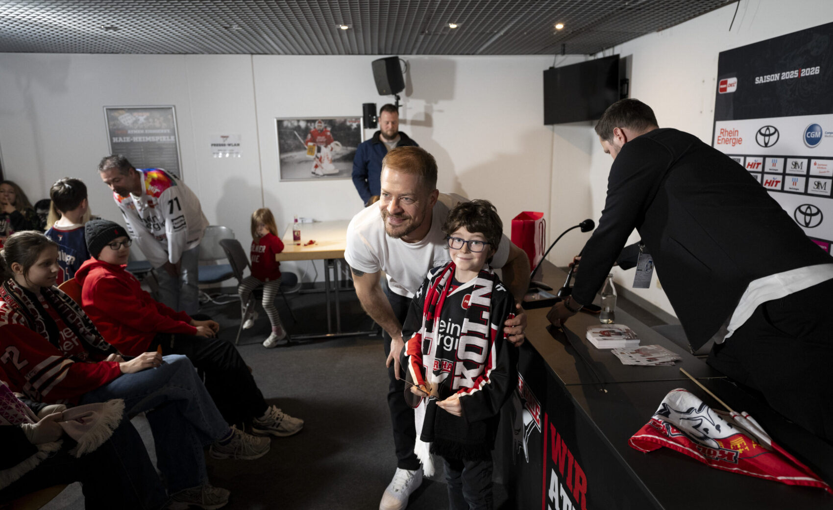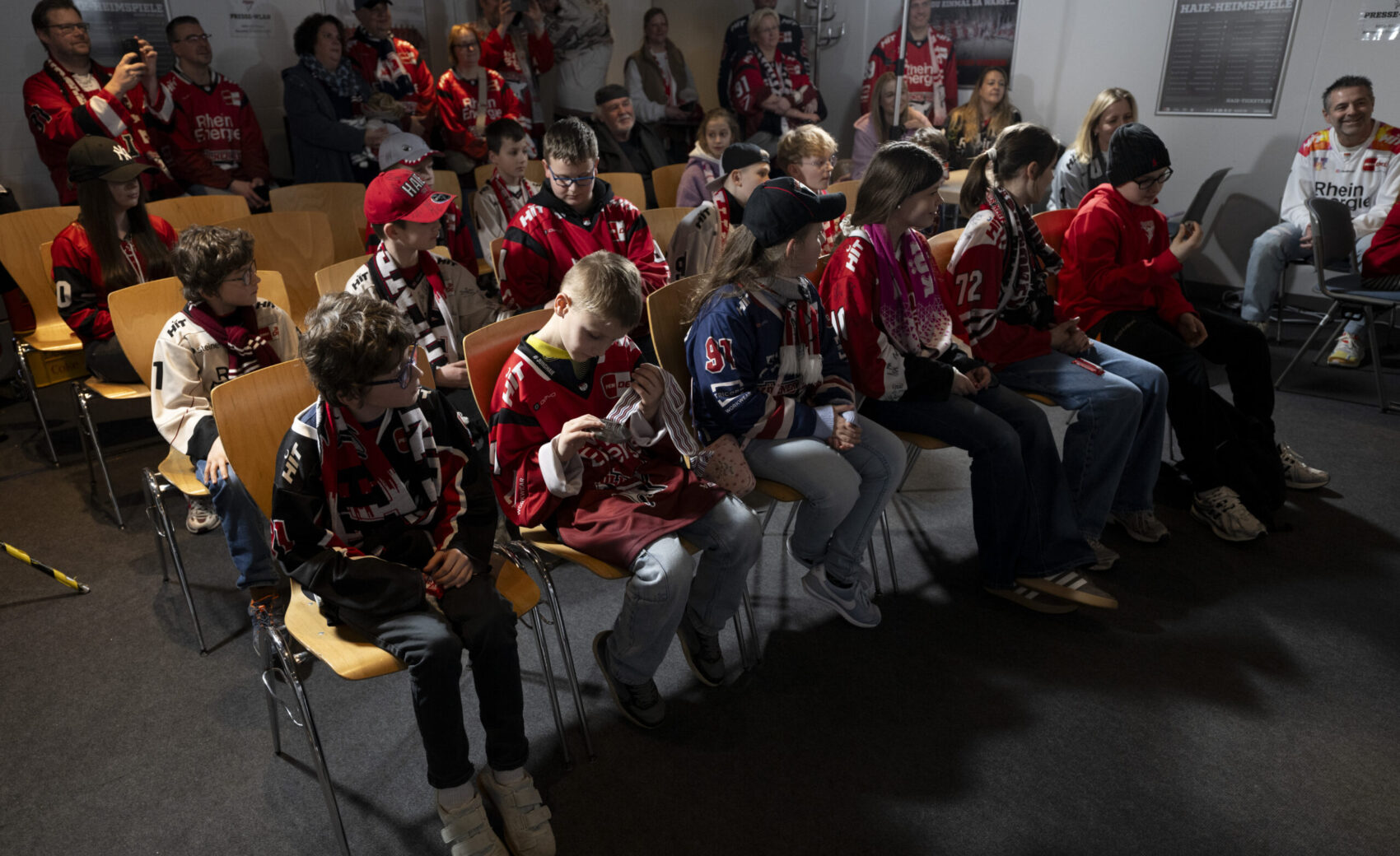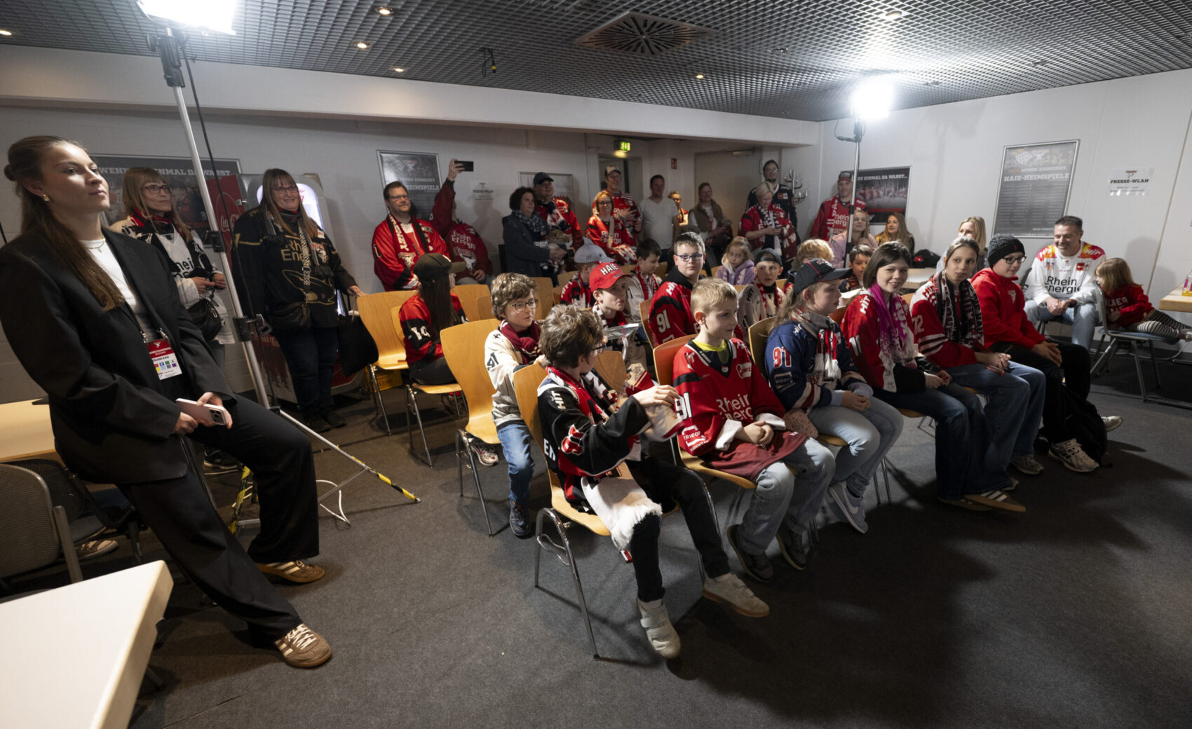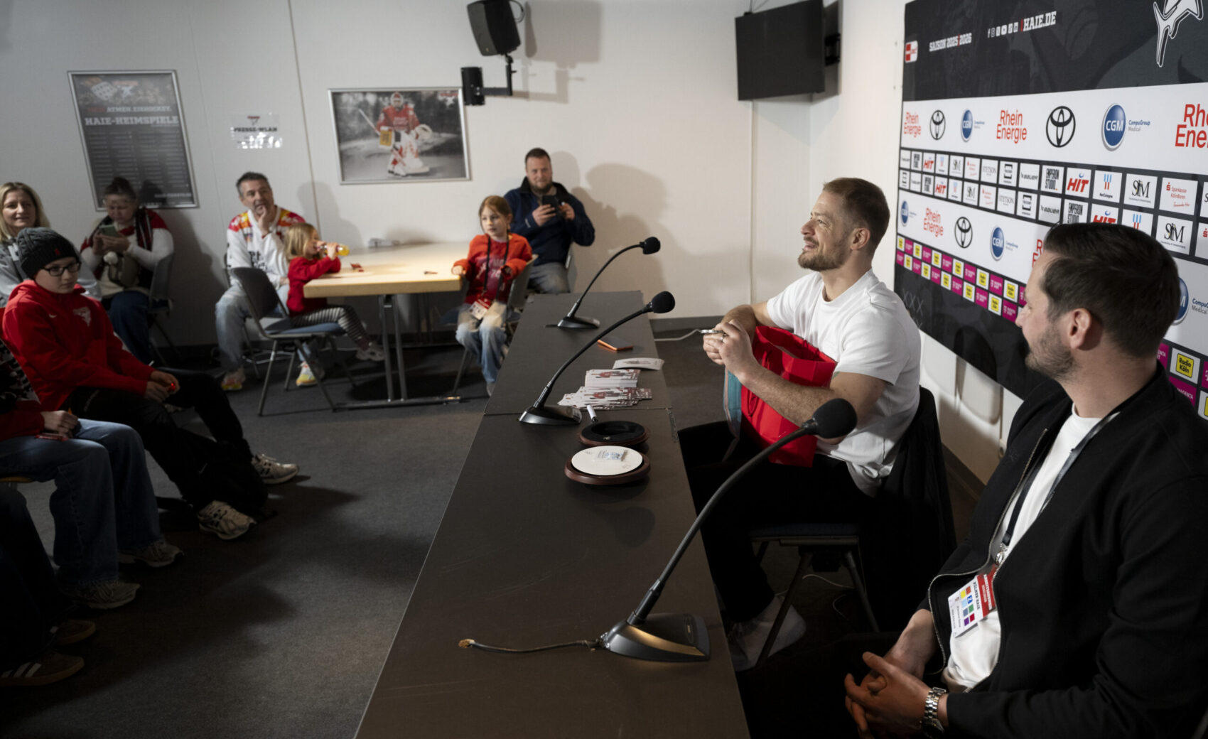 Im Anschluss an unser Heimspiel gegen die Eisbären Berlin (0:1) nahm sich unser Kapitän Moritz Müller in den Katakomben der LANXESS Arena Zeit für circa 20 Haie-Kids-Club-Mitglieder. Im Medienzentrum – also dort, wo normalerweise die Pressekonferenzen nach unseren Heimspielen stattfinden – beantwortete „Mo“ den Kids alle Fragen und stand zudem für Foto- und Autogrammwünsche zur Verfügung. Wir haben die besten Fotos des kurzweiligen Termins für euch zusammengestellt.