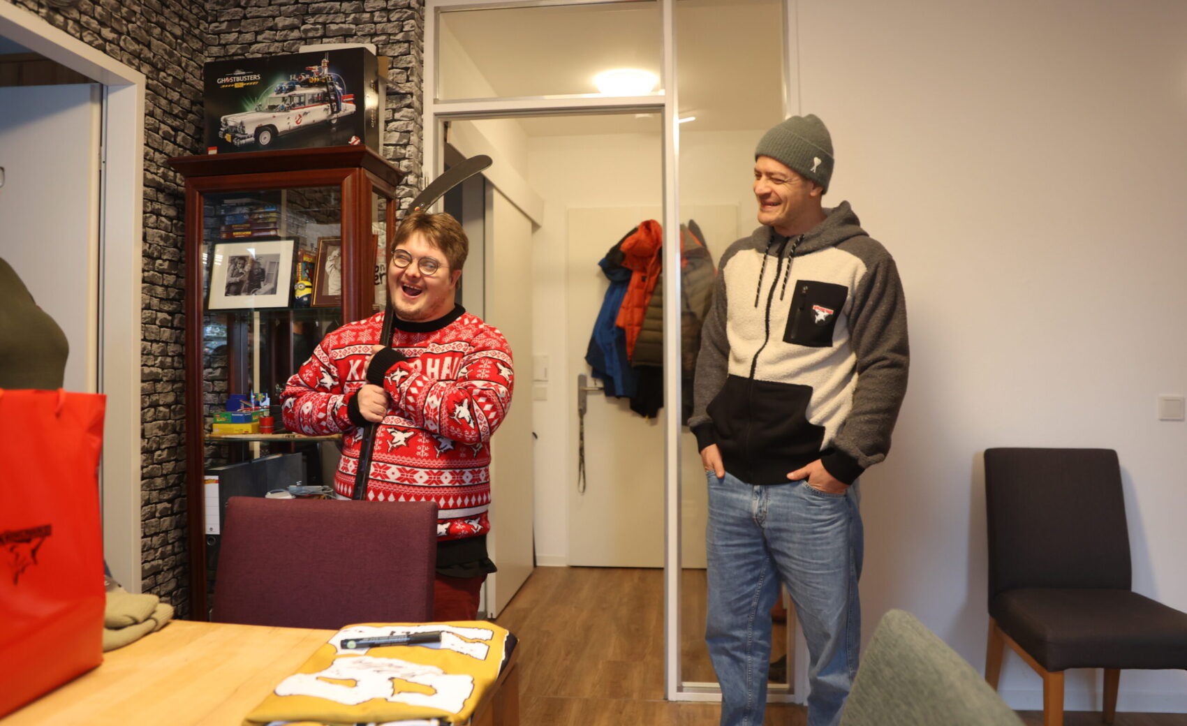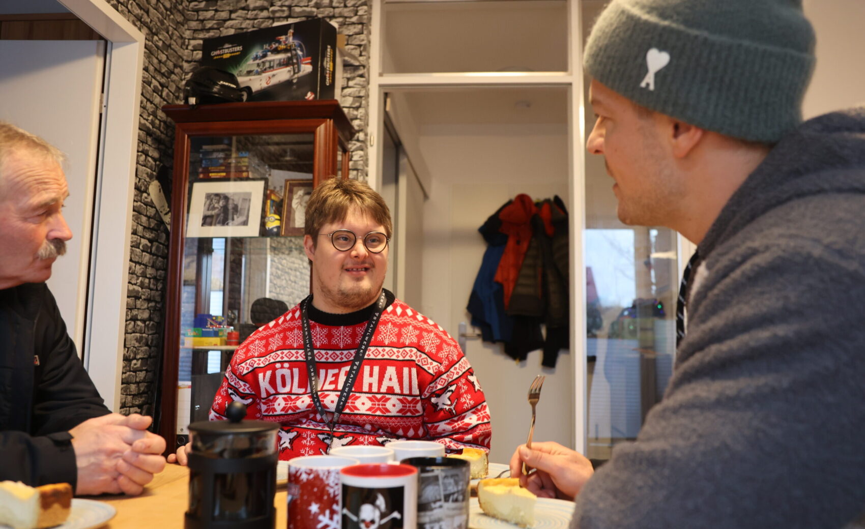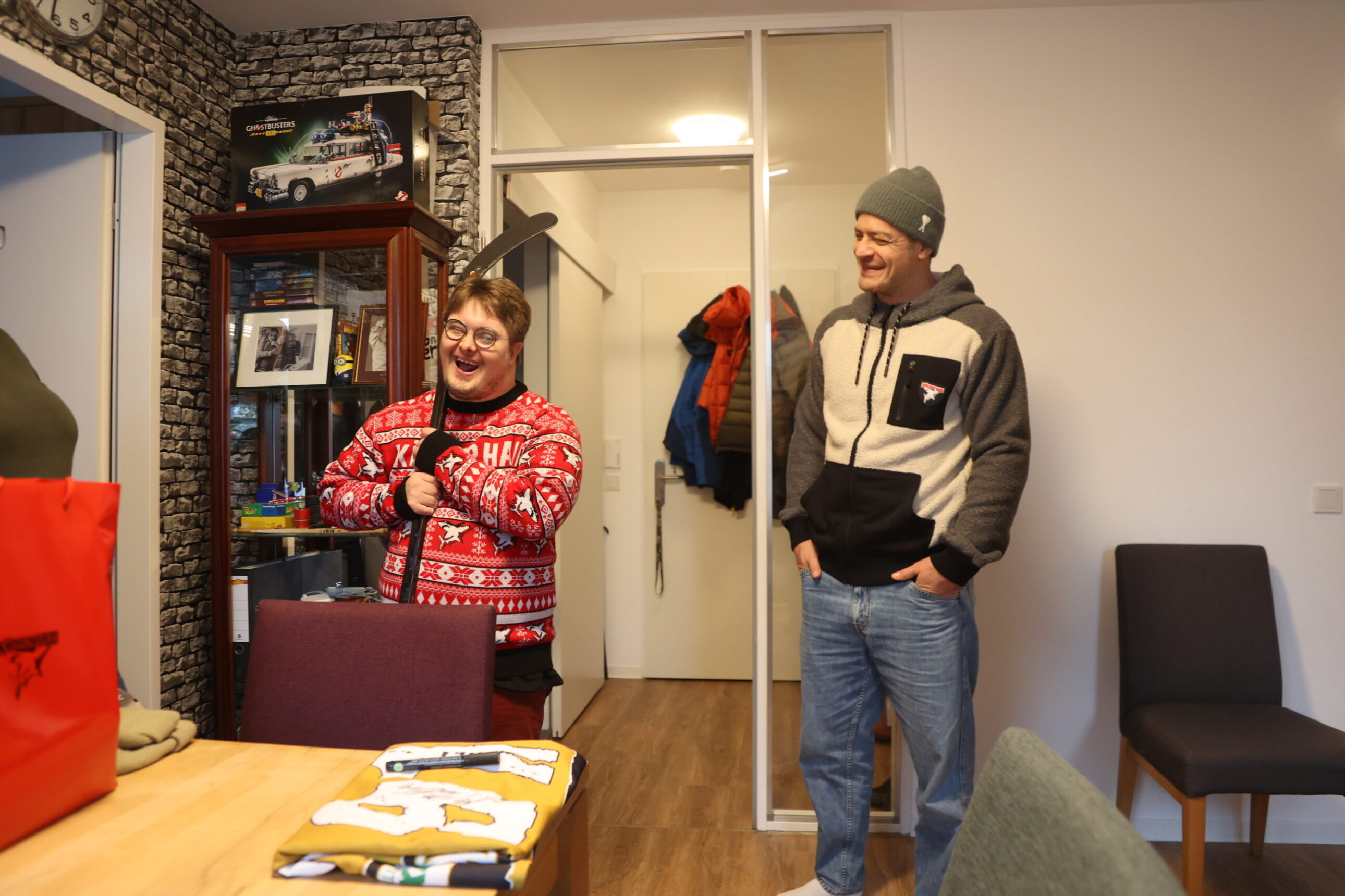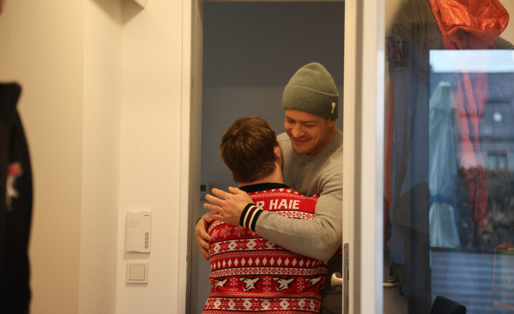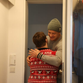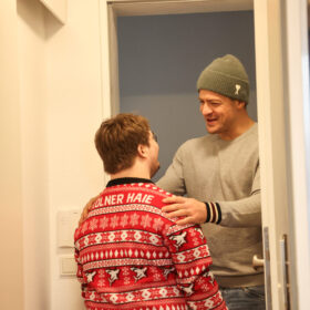 Als wir also von der ersten eigenen Wohnung hörten, kamen wir zusammen mit Mo auf die Idee, Jan und seiner Familie, die in den Plan eingebunden wurde, einen Besuch abzustatten. Also schnappten wir uns nach einem Trainingstag in der KA2 kurz vor Weihnachten das Auto und fuhren zusammen mit Mo die 20 Minuten in den Kölner Süden, wo Jan wartete, und von einem Termin wusste, nicht aber, dass sein großes Idol höchstpersönlich vorbeikommen würde.