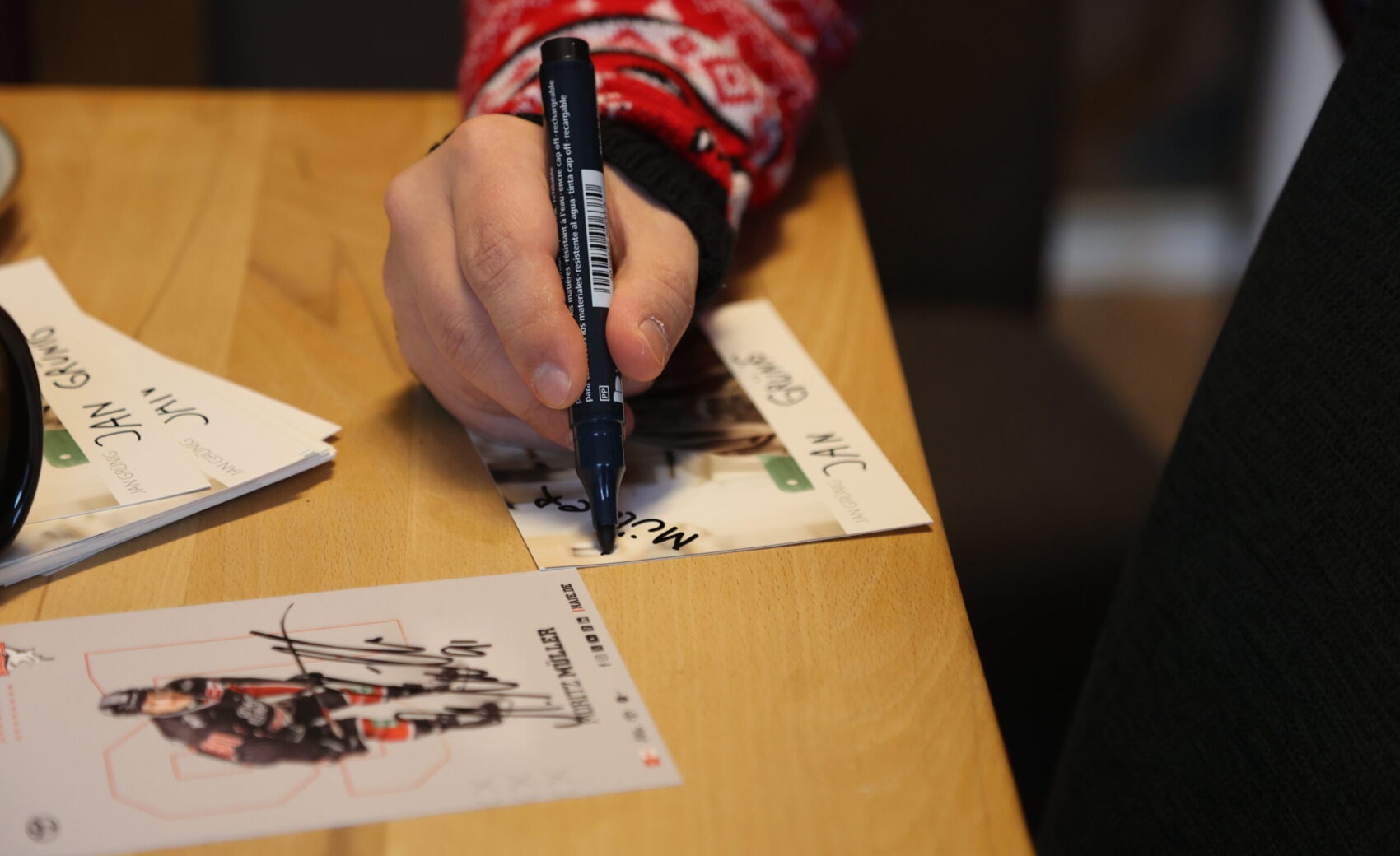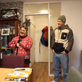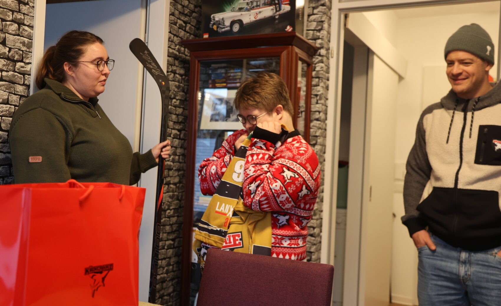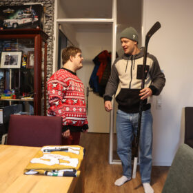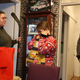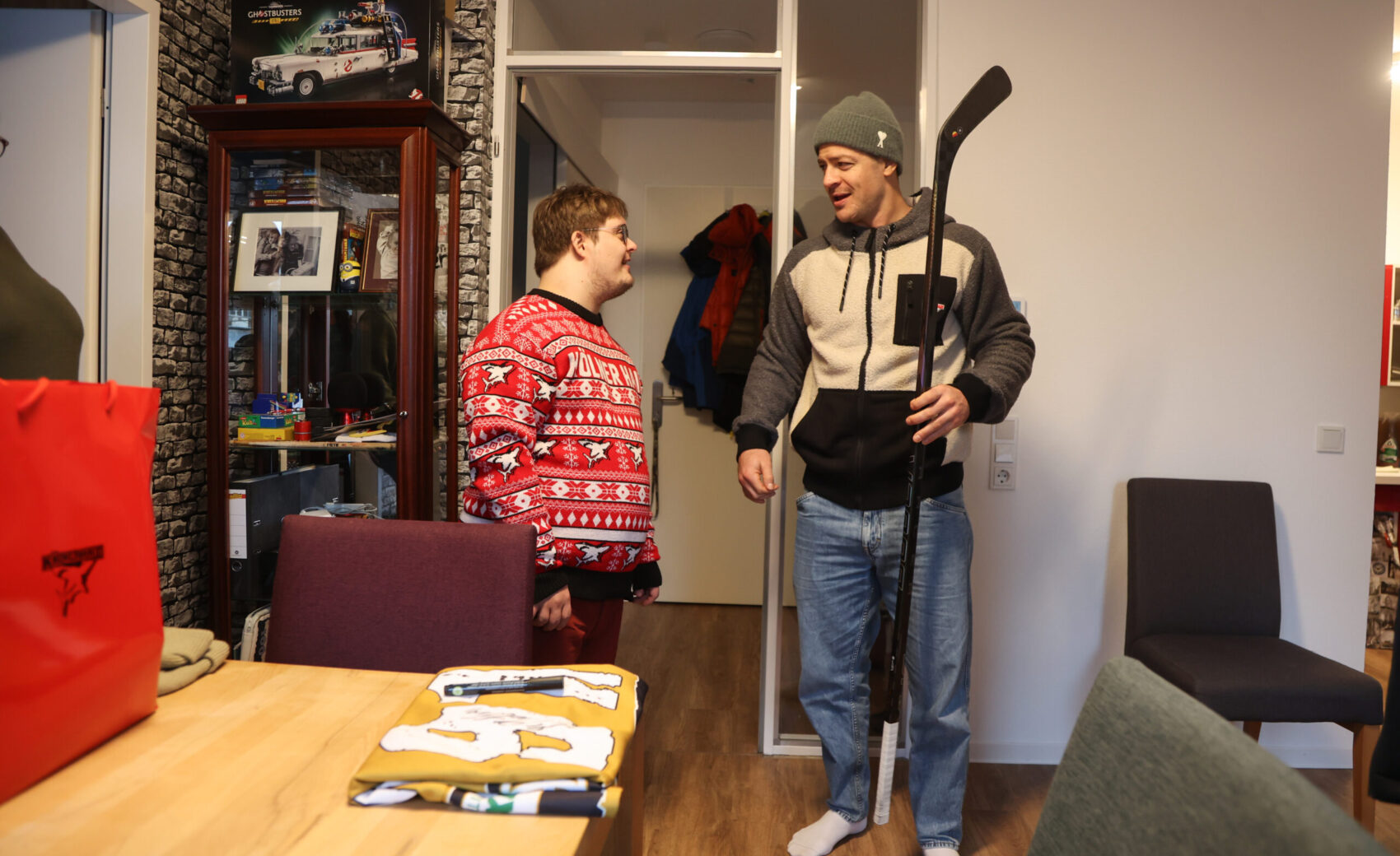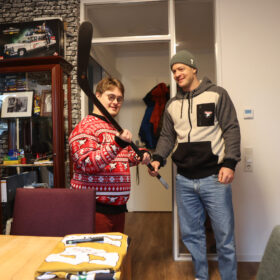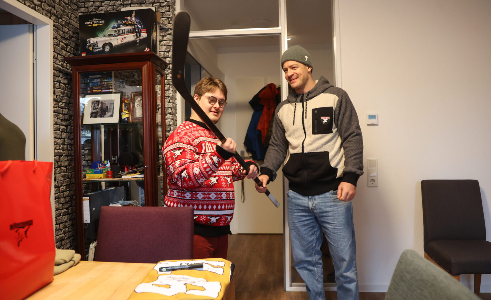 An der Tür angekommen, öffnete Jan und fiel beinahe hinten rüber, als er unseren Kapitän sah. Die Überraschung war gelungen, keine Frage. Nicht nur, dass Mo sich fast eine Stunde Zeit nahm, um mit Jan über Haie, Hobbies und das Leben zu philosophieren – unsere Nummer 91 hatte auch jede Menge Geschenke dabei, die der verdutzte Jan allesamt ohne Widerworte entgegennahm. Das persönliche Highlight war ein von Mo original gespielter und selbstverständlich unterschriebener Schläger. Aber auch eine finnische Mütze mit der Unterschrift von Kari Jalonen hatte es dem 25-Jährigen angetan – genauso wie Mo, der darauf bestand, ein Foto von Jan und der witzigen Mütze zu machen, um dieses an den Cheftrainer zu schicken.