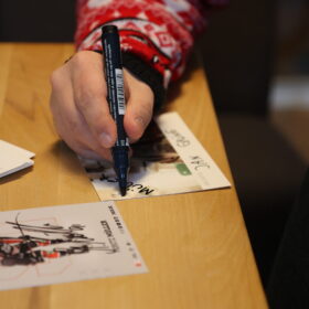 Nachdem auch die letzten selbstgemachten Stücke Käsekuchen verputzt waren, machte sich Mo dann auch wieder auf den Weg. Nicht aber, ohne noch ein schönes Gruppenfoto zu machen und von Jan ein Autogramm zu bekommen – immerhin spielte Jan fast 20 Jahre in der bekannten TV-Sendung „Lindenstraße“ und besitzt eigene Autogrammkarten, die er uns stolz zeigte.