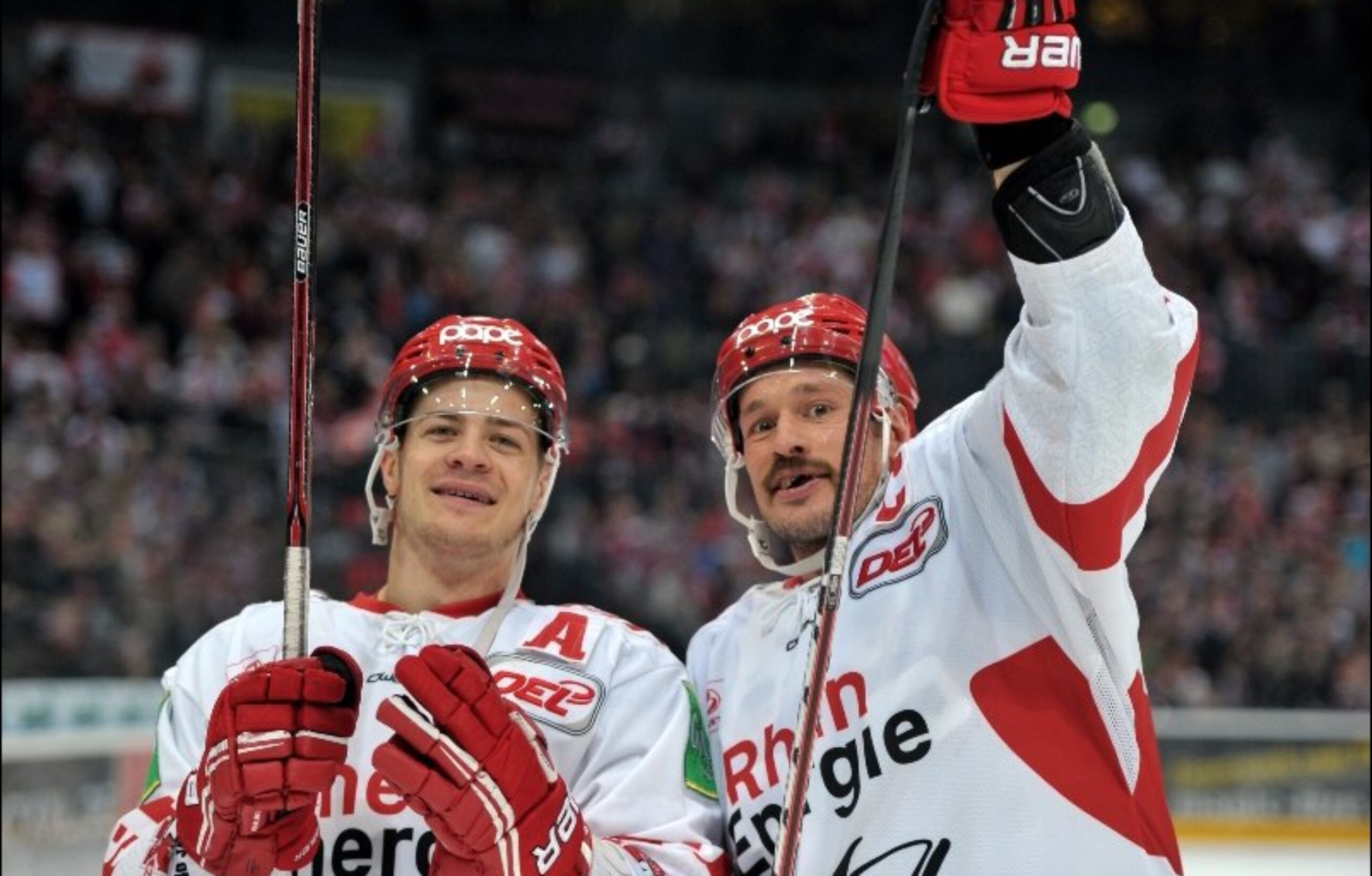 John Tripp und Moritz Müller wollen ihre Verletzungspause sinnvoll nutzen und helfen am Freitag beim Heimspiel gegen Krefeld beim Losverkauf für die Haie-Charity.