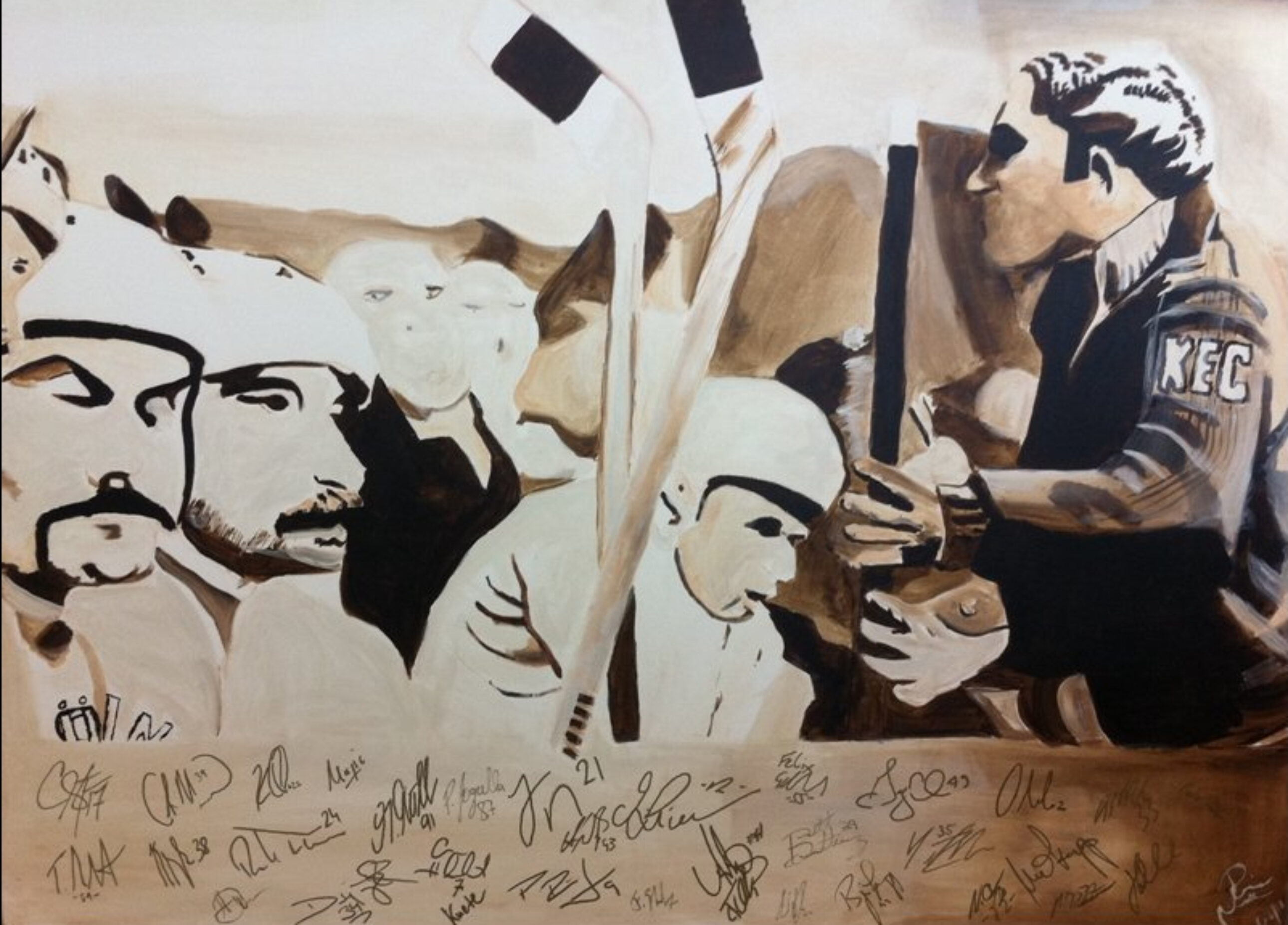Wenn es um den guten Zweck geht, werden die Haie-Spieler auch gerne selbst mal aktiv. Beim heutigen Heimspiel gegen die Krefeld Pinguine stiftet Stürmer Nathan Robinson der Charity ein Bild, das er selbst in zwei Wochen Arbeit gemalt hat. In Anlehnung an das Jubiläumsjahr des KEC zeigt die ca. 1,40m x 0,90m groe Leinwand ein Bild der Haie-Mannschaft aus den 70ern mit ihrem damaligen Trainer Kiessling. Das Gemälde ist zudem von allen aktuellen KEC-Spielern in gold signiert.