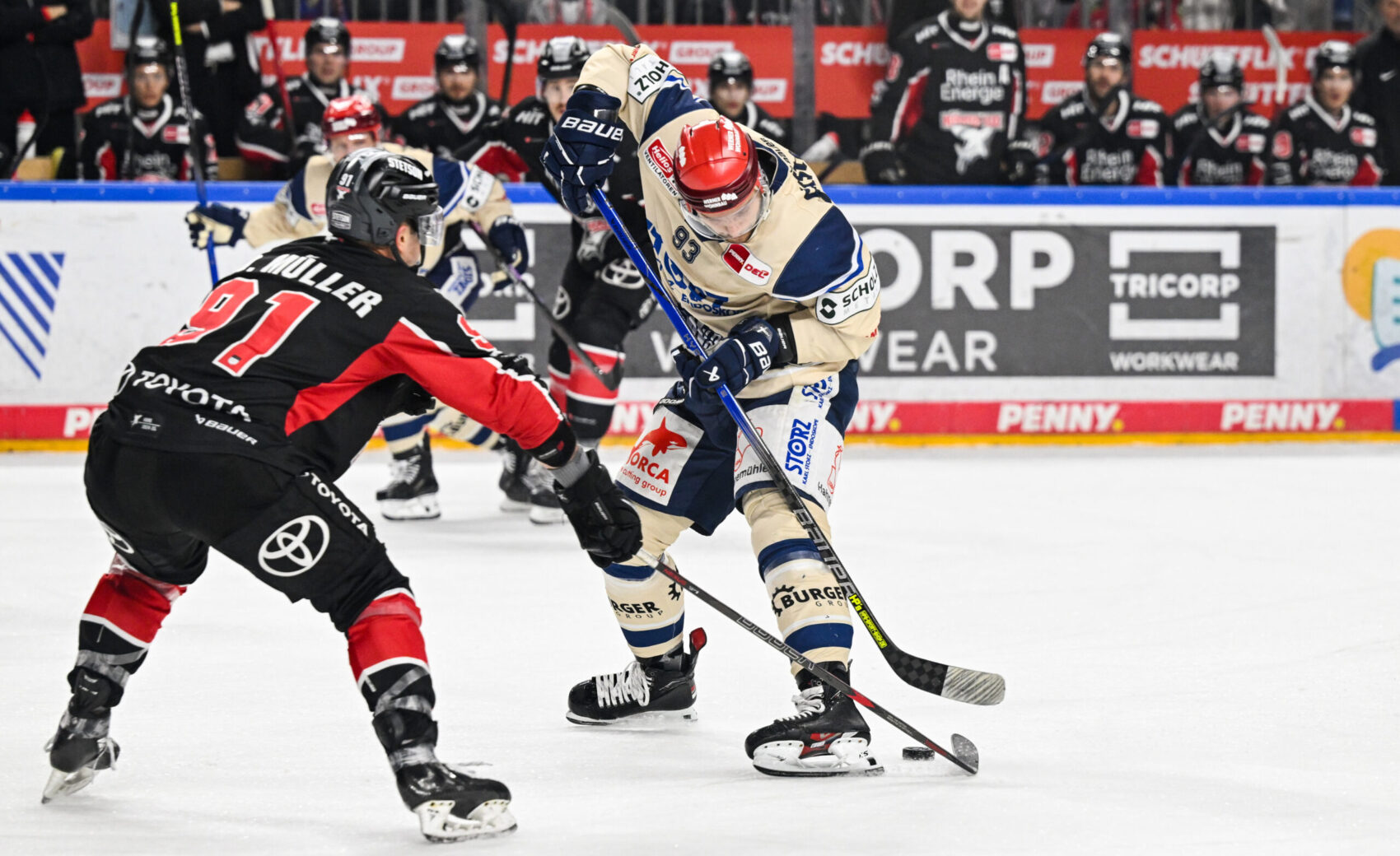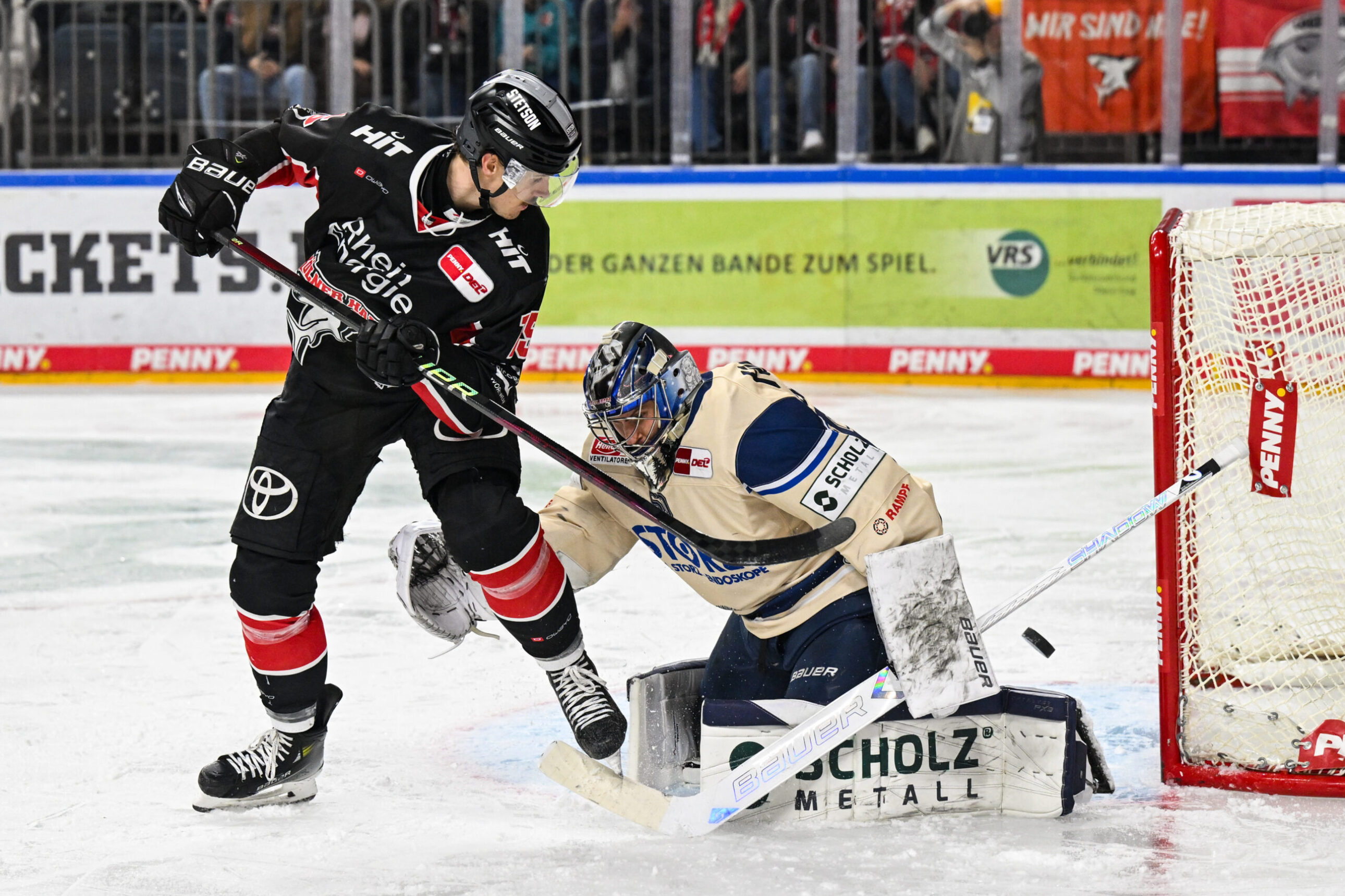 Wir starteten gut in die Partie und konnten uns durch Maxi Kammerer gleich den ersten Hochkaräter der Partie erspielen. Nach einem feinen Pass in der neutralen Zone von Frederik Storm zog unsere Nummer neun mit Geschwindigkeit Richtung Tor und zwang Joacim Eriksson, der einen guten Tag erwischen sollte, zum ersten Save der Partie (1.). Auf der Gegenseite meldeten sich auch die Gäste aus Baden-Württemberg unmittelbar nach unserer Chance mit dem ersten Hochkaräter der Partie an – Tyson Spink wurde im Slot freigespielt und hielt die Kelle in den starken Pass. Mirko Pantkowski zeigte bei dem Abschluss seine Klasse und hielt die Null fest (2.).