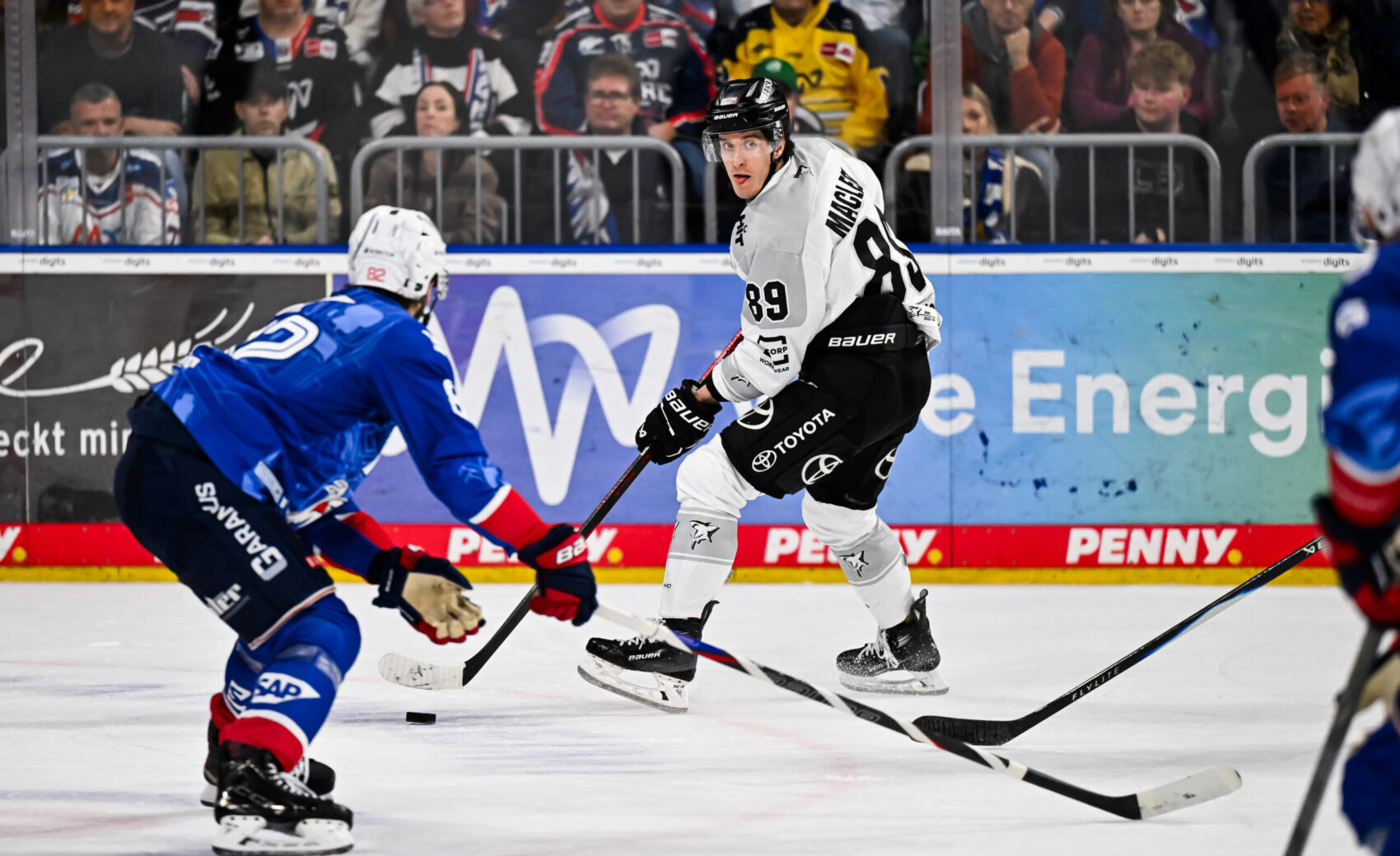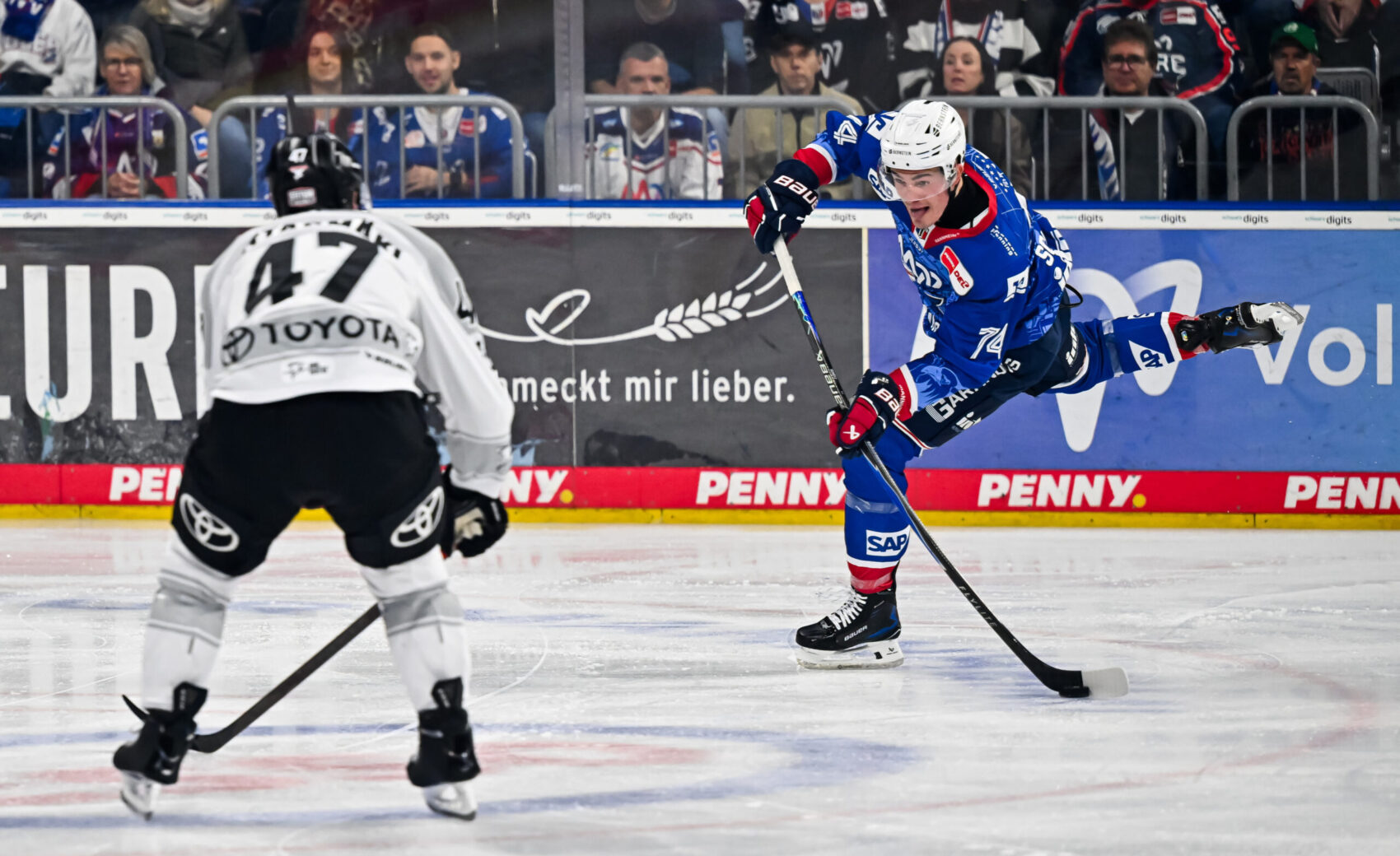 Auch das zweite Drittel startete intensiv mit guten Chancen für beide Teams. Für Mannheim verpasste Kälble von der blauen Linie knapp (22.), während wir anschlieend Oberwasser bekamen und gleich zu mehreren vielversprechenden Abschlüssen kamen. Leider fanden die Versuche von MacLeod (24.), Kaski (25.) und Schnarr (28.) ihren Weg nicht ins Netz. Das sollte uns aber nicht aus dem Konzept bringen – im Gegenteil: Veli-Matti Vittasmäki erzielte kurz darauf den hochverdienten Ausgleich (28.). Dominik Bokk bekam die Scheibe trotz Gegnerdruck im Slot zum etwas weiter hinten postierten Finnen, der freie Bahn hatte und den Puck humorlos in den Winkel schweite, 1:1!