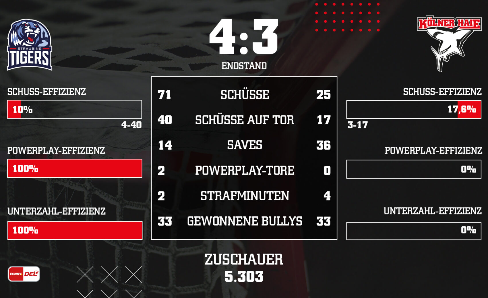 Beiden Teams war in den Schlussminuten anzumerken, nicht den entscheidenden Fehler machen, aber gleichzeitig auch drei Punkte einfahren zu wollen. So entwickelte sich ein offener Schlagabtausch – mit dem besseren Ende für die Tigers. 32 Sekunden vor dem Ende kam Braun frei im Haie-Drittel zum Abschluss, schaute Hudacek aus und traf ins kurze Eck zum 4:3-Siegtreffer für die Hausherren.