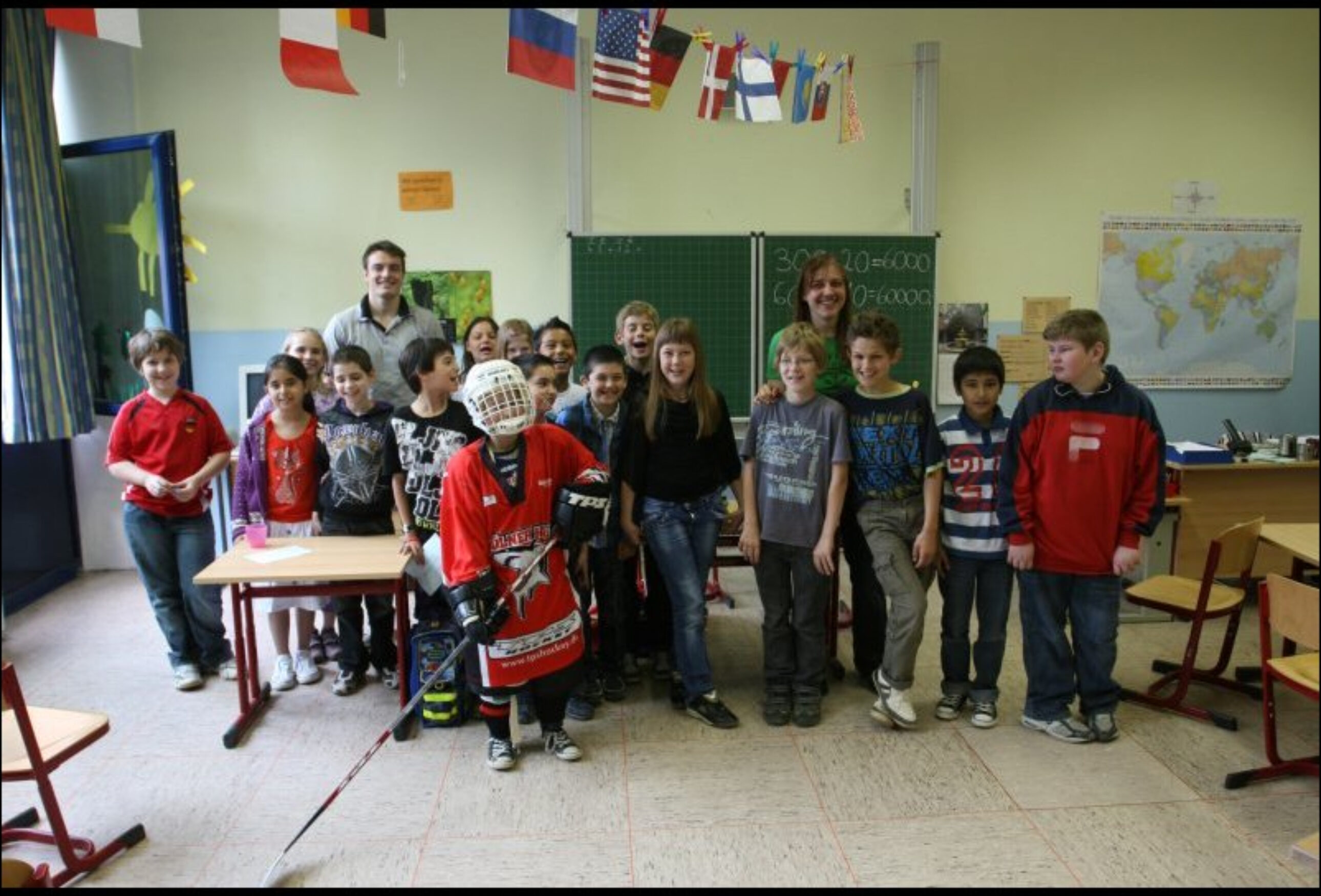 Dass die Kinder gut vorbereitet ins Treffen mit dem DEL-Spieler gingen, lag einerseits an der „eishockey-verrückten“ Lehrerin Frau Schulze, aber auch an „Puckelino“. Dabei handelt es sich um ein Lern- und Spaheft, das den Kindern auf sinnvolle Art und Weise Spa an Sport und Lust am Lernen vermittelt und gleichzeitig das Thema Eishockey näher bringt. Das Heft wurde von den Klassen vor dem Termin mit Norman Hauner durchgearbeitet.