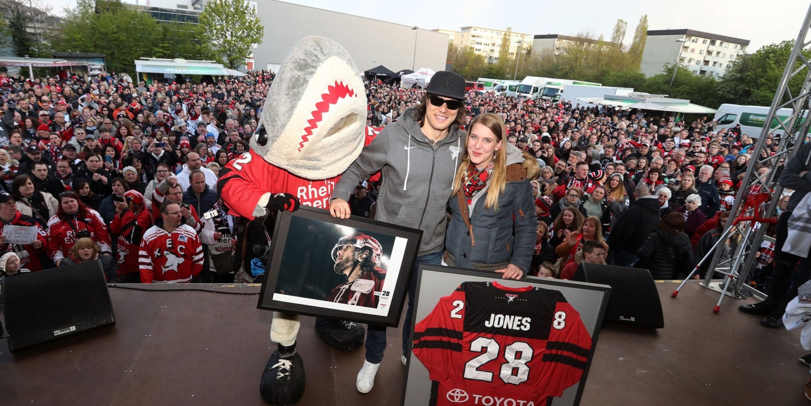 Bei Kölsch, Bratwurst und Live-Musik zeigte sich das Haie-Team nochmals auf der Bühne und mischte sich im Anschluss unters Fan-Volk. Traditionell wurde dabei auch die finale Jagd auf die letzten Autogramme der Saison eröffnet – mit Erfolg. Vor allem Publikumsliebling Ryan Jones, der seine Karriere beendete, schrieb Autogramme und stand für Fotos parat, bis es dunkel wurde rund um das Haie-Zentrum. Gewürdigt wurden seine Leistungen in den vergangenen knapp fünf Jahren mit einem tollen Spruchband, das die Fans präsentierten: „Inspiring Example for every Athlete! Thanks for your Passion, Commitment and Fight! #28 Forever one of us!“