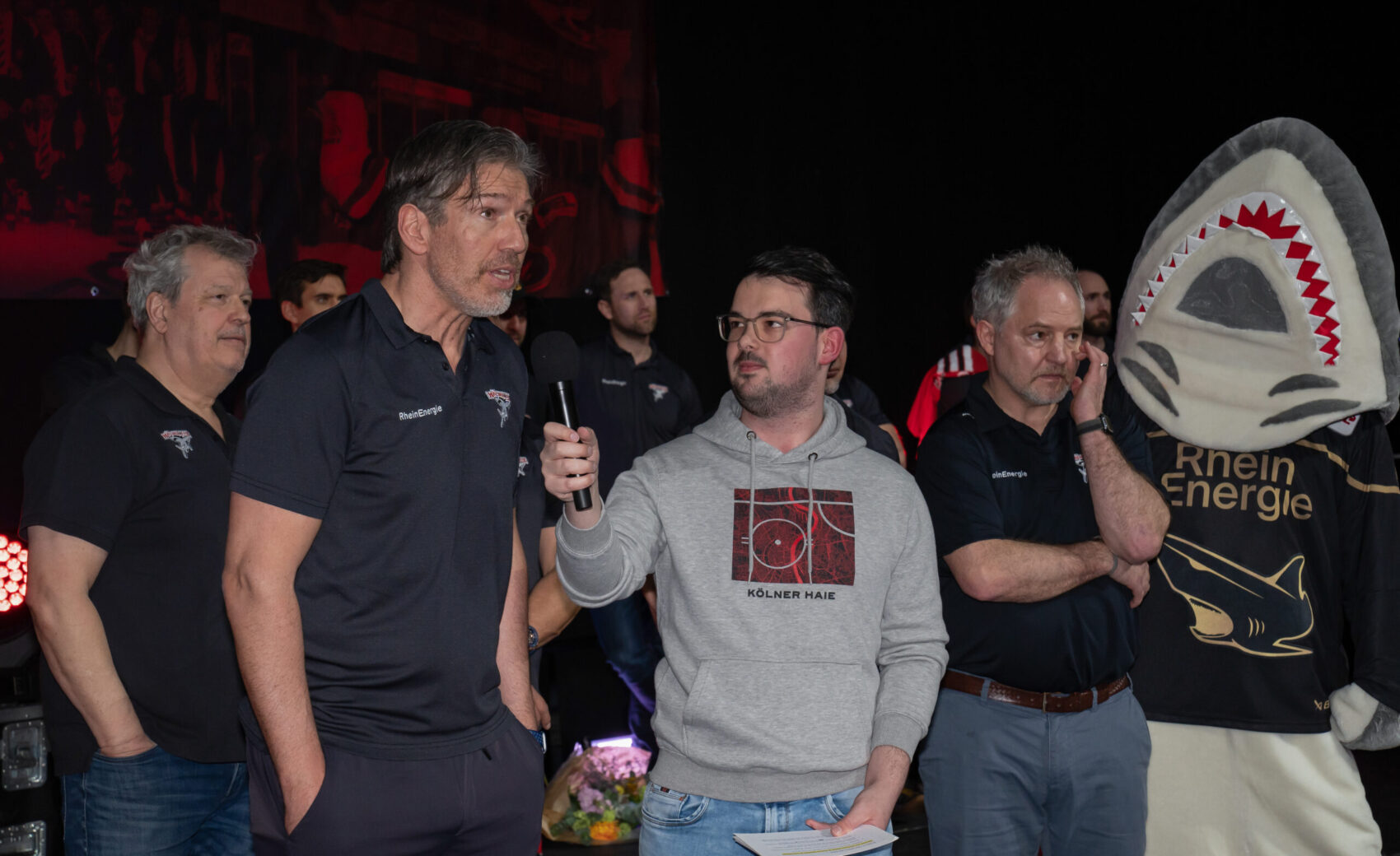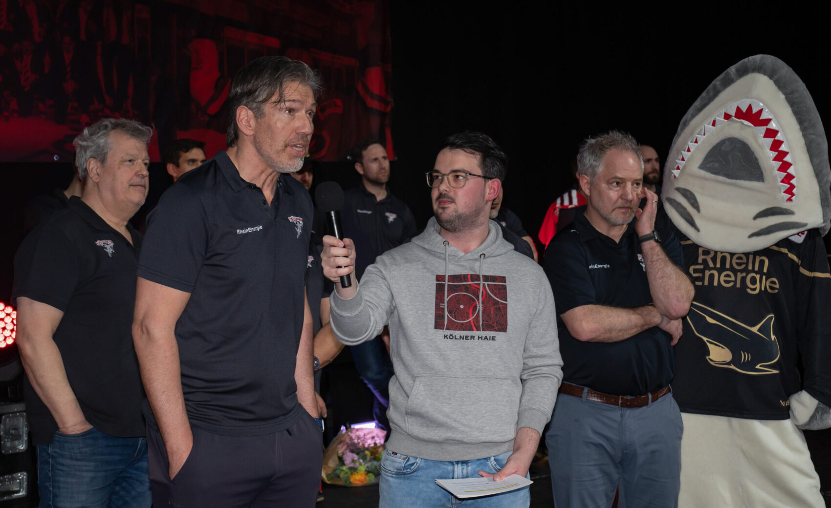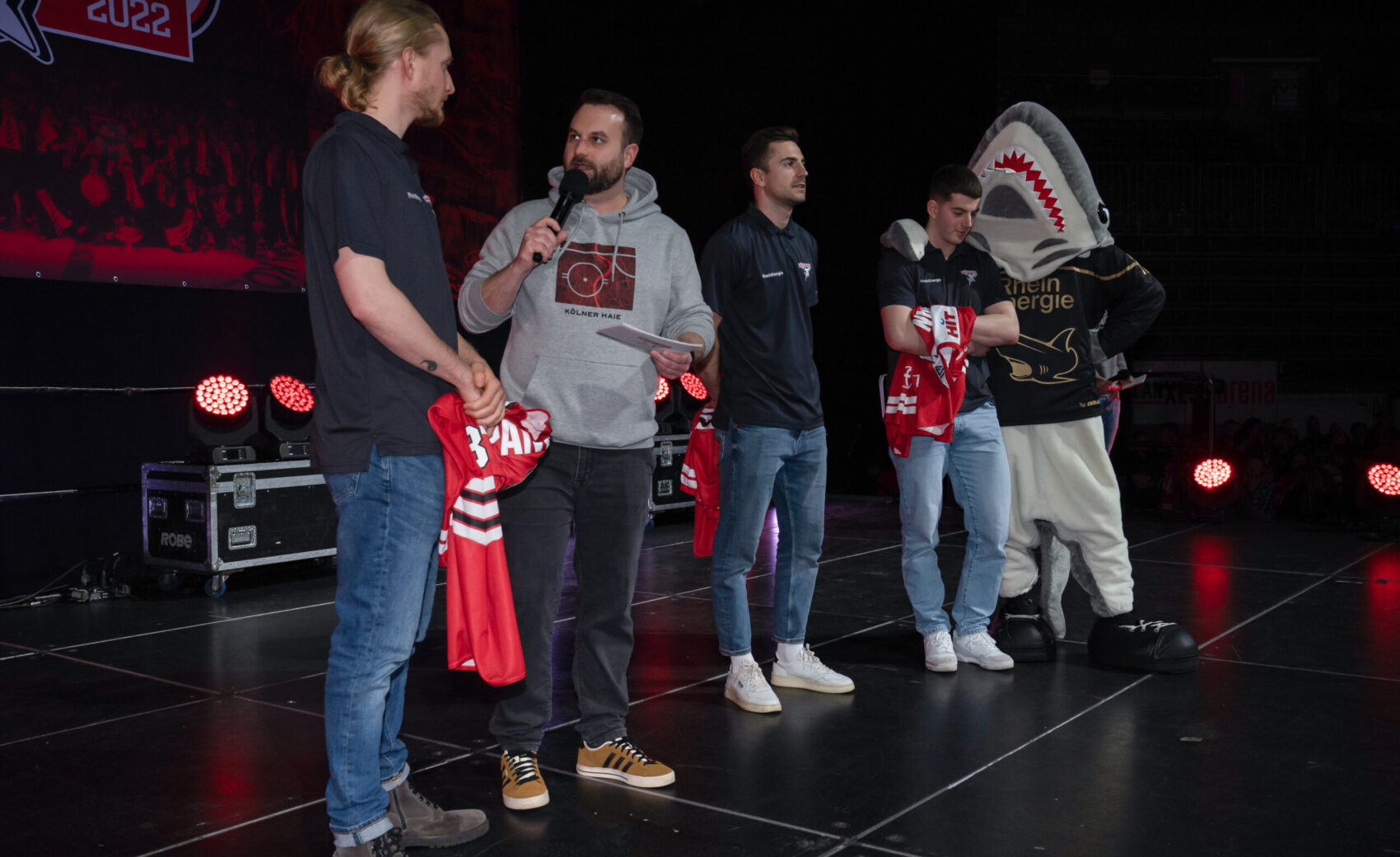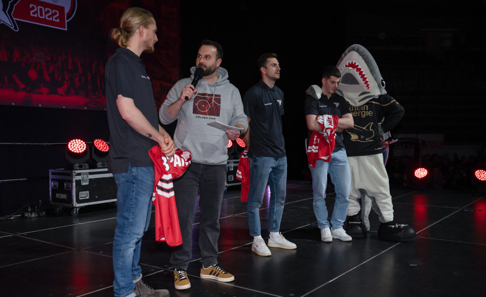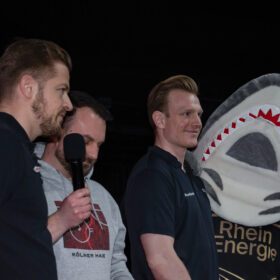 Besonders war auch der Auftritt der Kölner Kultband Klingelköpp, die nach der Talkrunde rund 45 Minuten ihre Lieder zum Besten gaben. Anschließend betraten die Haie-Spieler in kleinere Gruppen die Bühne und wurden zur Saison, zu den Sommerplänen und zu vielen weiteren Themen befragt – kurzweilig eben. Emotional wurde es auch hier, denn offiziell und mit großem Applaus verabschiedet, wurden folgende Spieler: Oleg Shilin, Alex Roach, Ryan Stanton, Jack Dougherty, Alexander Oblinger, Zach Sill, Jon Matsumoto und Julian Chrobot.