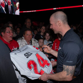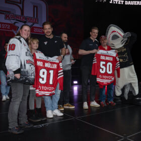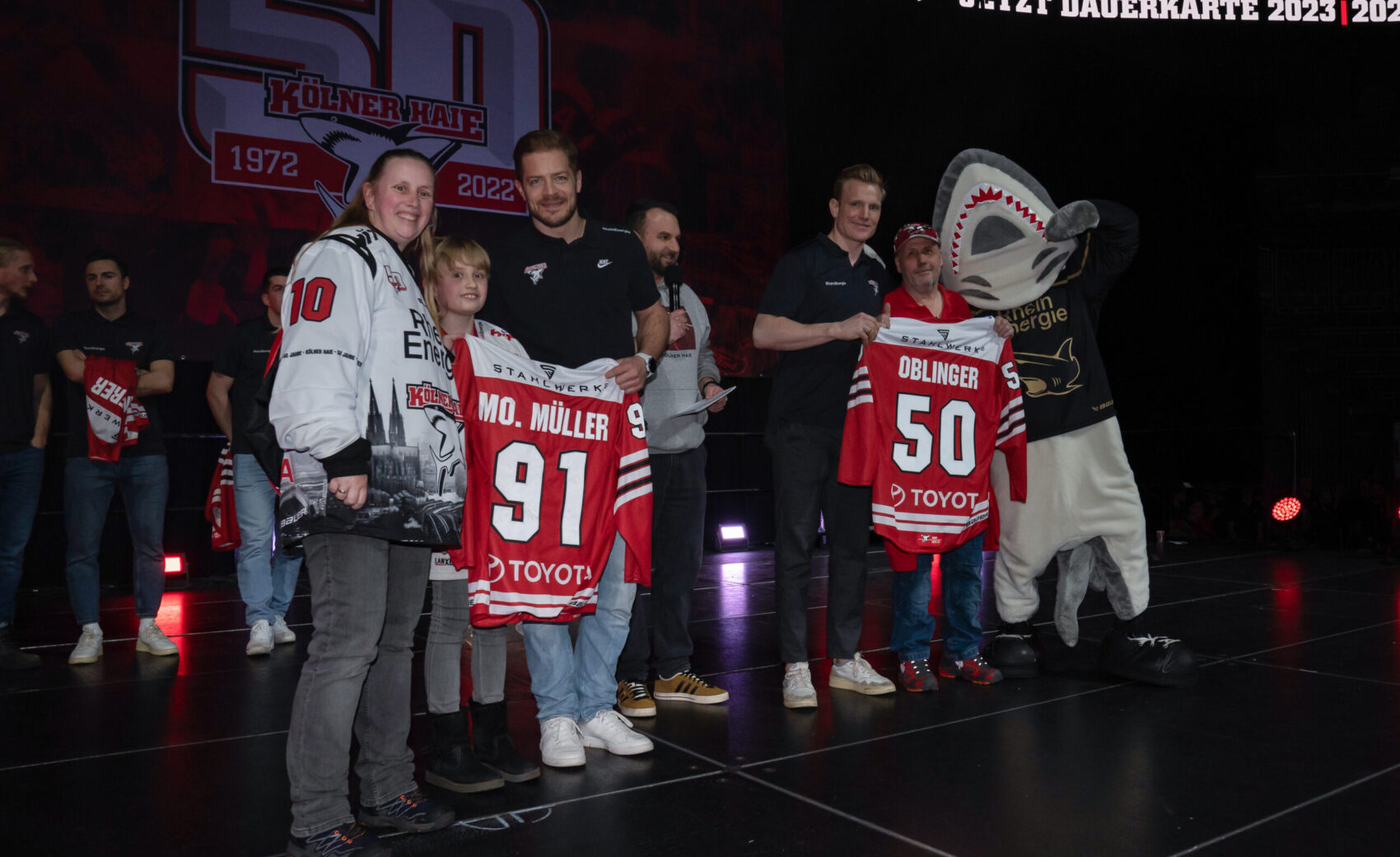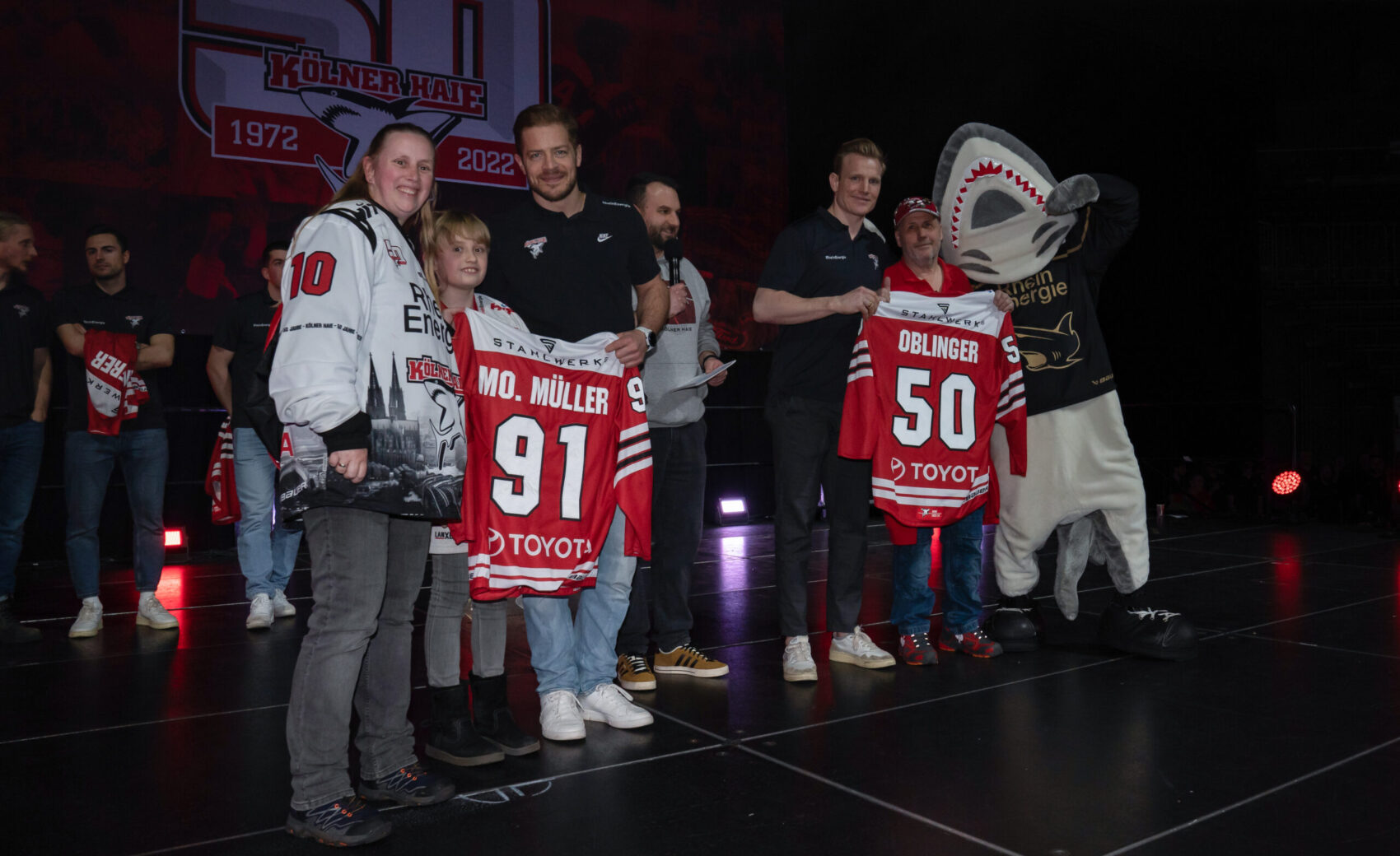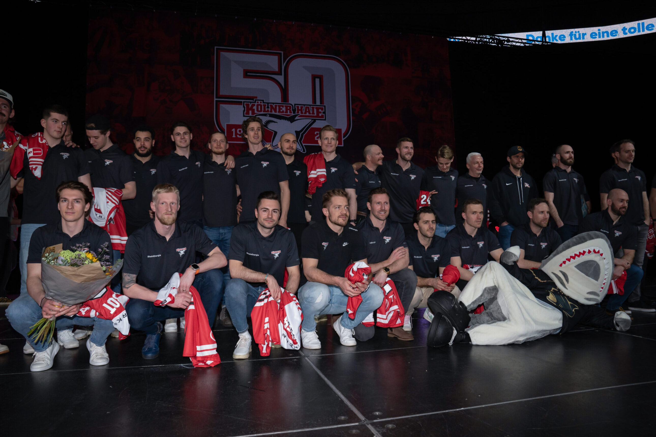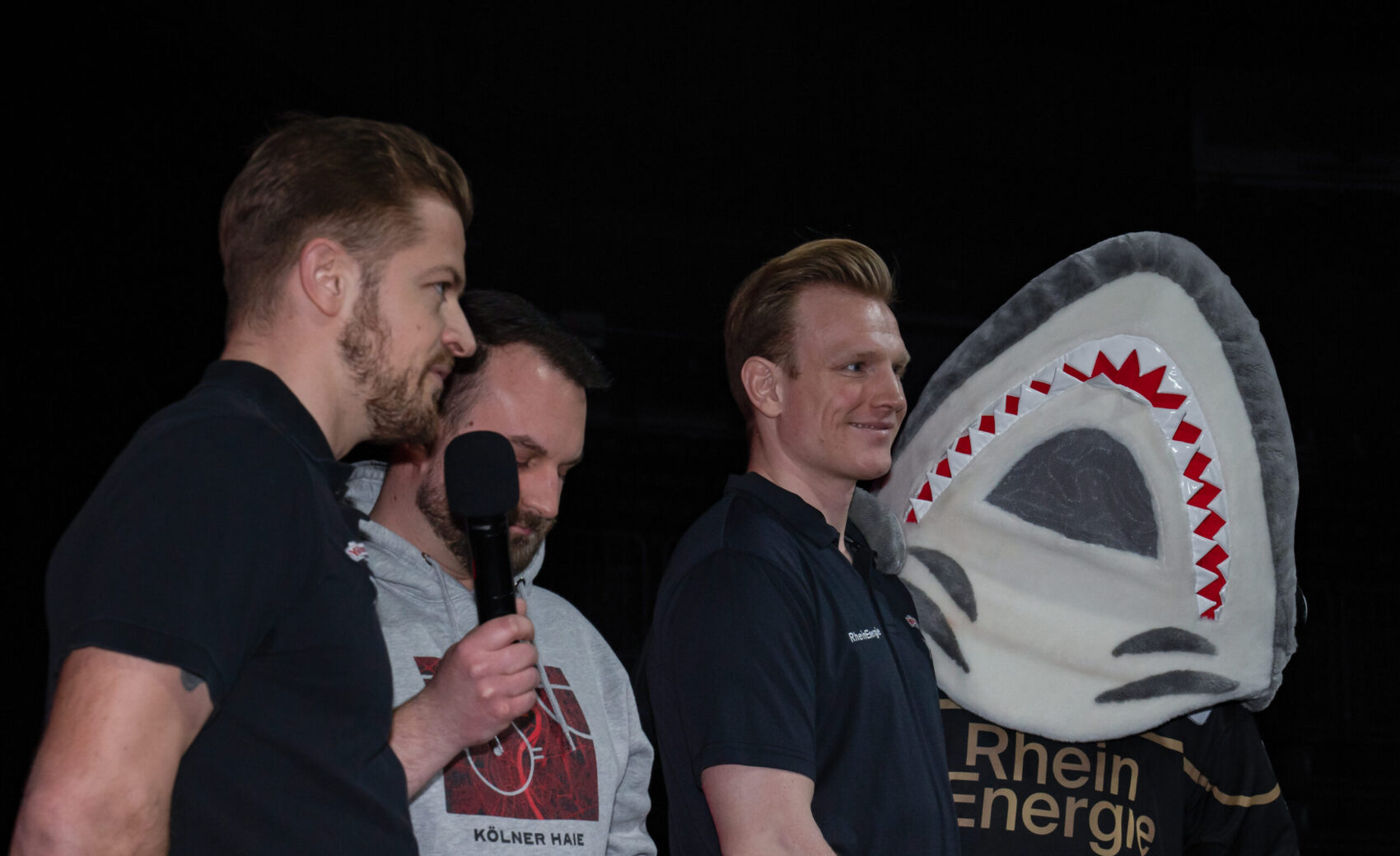 Besonders war auch der Auftritt der Kölner Kultband Klingelköpp, die nach der Talkrunde rund 45 Minuten ihre Lieder zum Besten gaben. Anschließend betraten die Haie-Spieler in kleinere Gruppen die Bühne und wurden zur Saison, zu den Sommerplänen und zu vielen weiteren Themen befragt – kurzweilig eben. Emotional wurde es auch hier, denn offiziell und mit großem Applaus verabschiedet, wurden folgende Spieler: Oleg Shilin, Alex Roach, Ryan Stanton, Jack Dougherty, Alexander Oblinger, Zach Sill, Jon Matsumoto und Julian Chrobot.