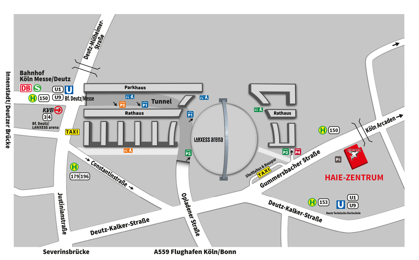 Der Parkplatz P5 steht am Tag der Saisoneröffnungsfeier nicht als Parkfläche zur Verfügung. Die Parkhäuser der LANXESS arena haben geöffnet, könnten durch eine Veranstaltung in der Arena jedoch zum Abend voll werden. Zusätzlich bietet sich das Parkhaus der Köln Arcaden als Parkmöglichkeit an. Ebenfalls könnt ihr mit den öffentlichen Verkehrsmitteln (U-Bahn Haltestelle Deutz Technische Hochschule / Bushaltestelle Gummersbacher Str.) anreisen.