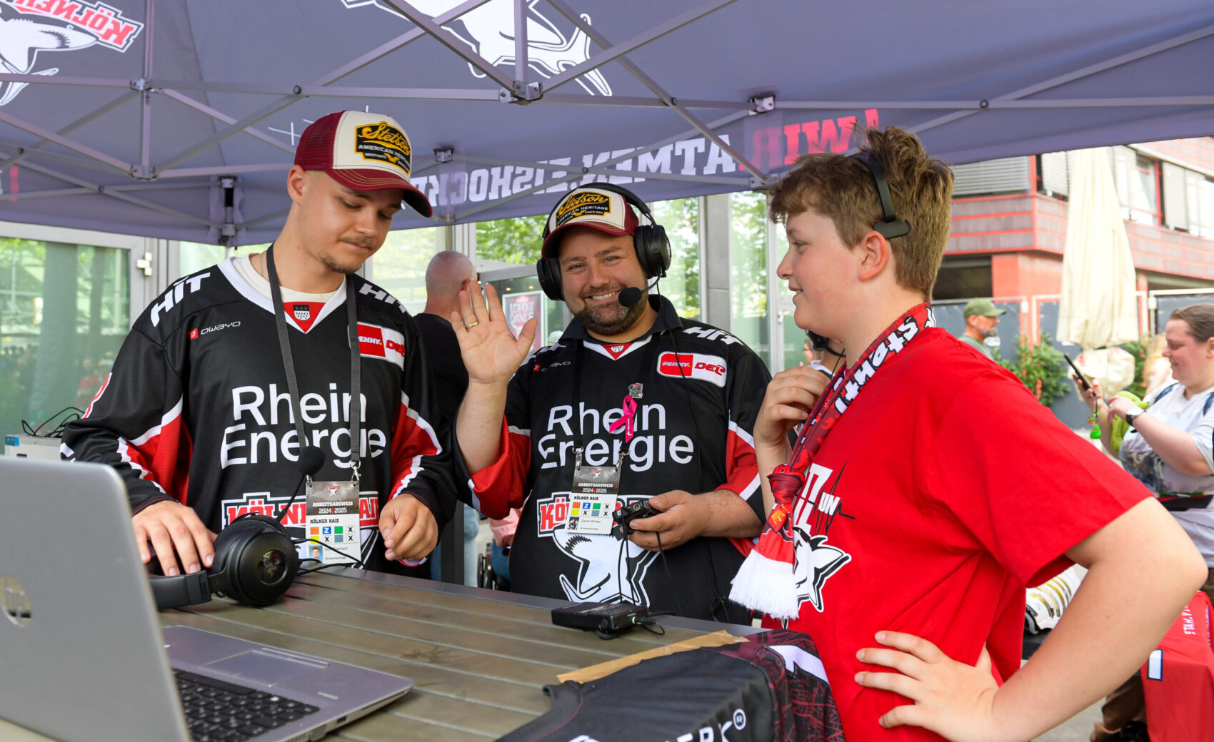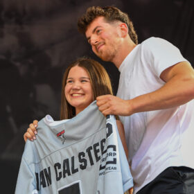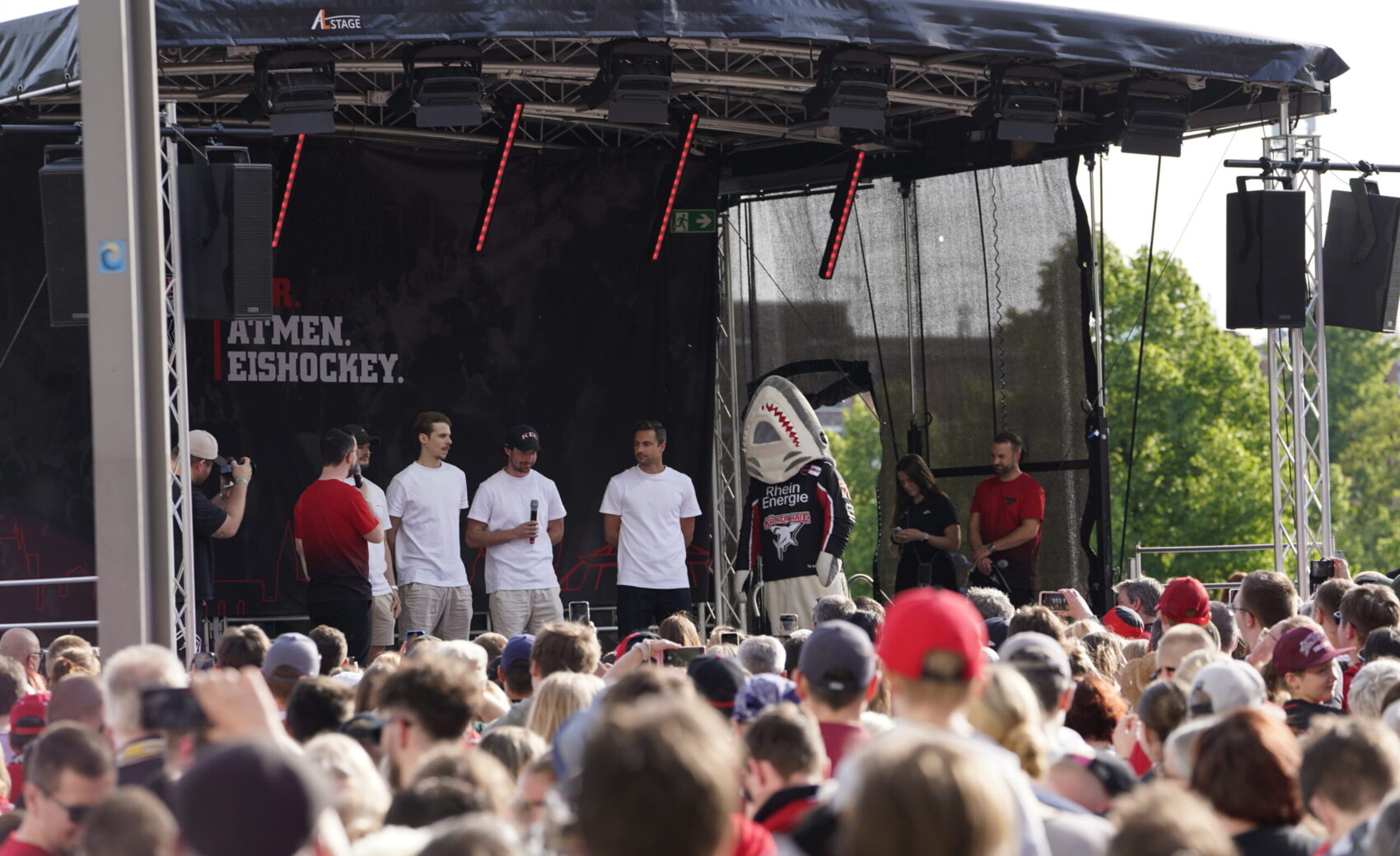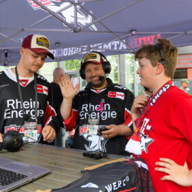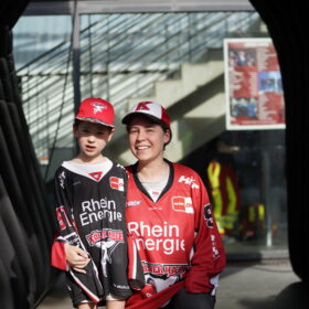 Zuvor waren Mannschaft, Trainerteam und der dazugehörende Staff um Betreuerteam, Ärzte, Physios und Co. auf der großen Bühne im Schatten der LANXESS arena, um sich dort den Fragen unserer Moderatoren Jason Schade und Tobias Zeller zu stellen. Immer wieder wurden dabei auch kurzweilige Quizfragen und Fragen der Fans eingestreut, die uns im Vorfeld der schönen Veranstaltung erreicht hatten.