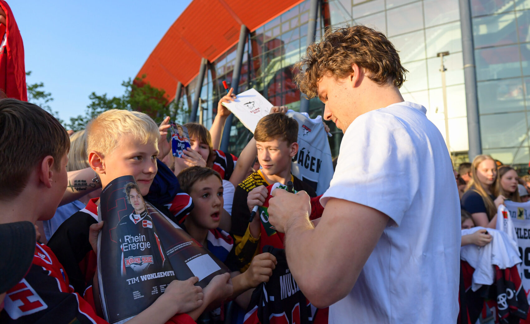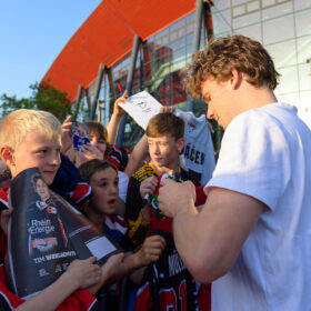 Bis weit nach 21 Uhr verweilte der Großteil unserer Jungs an der LANXESS arena und stand nahezu für alle Foto- und Autogrammwünschen parat – besonders Julius Hudacek gab sein Bestes und versorgte die zahlreich wartenden Fans an der Bühne bis in die Dämmerung. Die Autogramme des scheidenden Torhüters waren sehr begehrt.