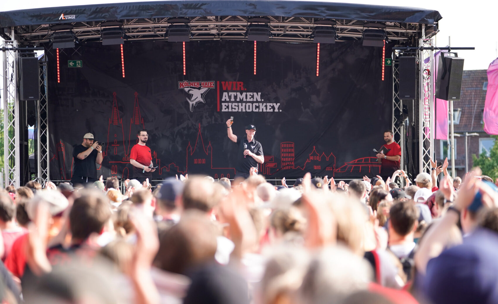 Auch Haie-Geschäftsführer Philipp Walter, Sportdirektor Matthias Baldys und Cheftrainer Kari Jalonen gaben vor rund 3.000 gut gelaunten Haie-Fans in Einzelinterviews Einblicke in die Gefühlslage nach dem Gewinn der Vizemeisterschaft und gleichzeitig kleinere Ausblicke auf die Zukunft.