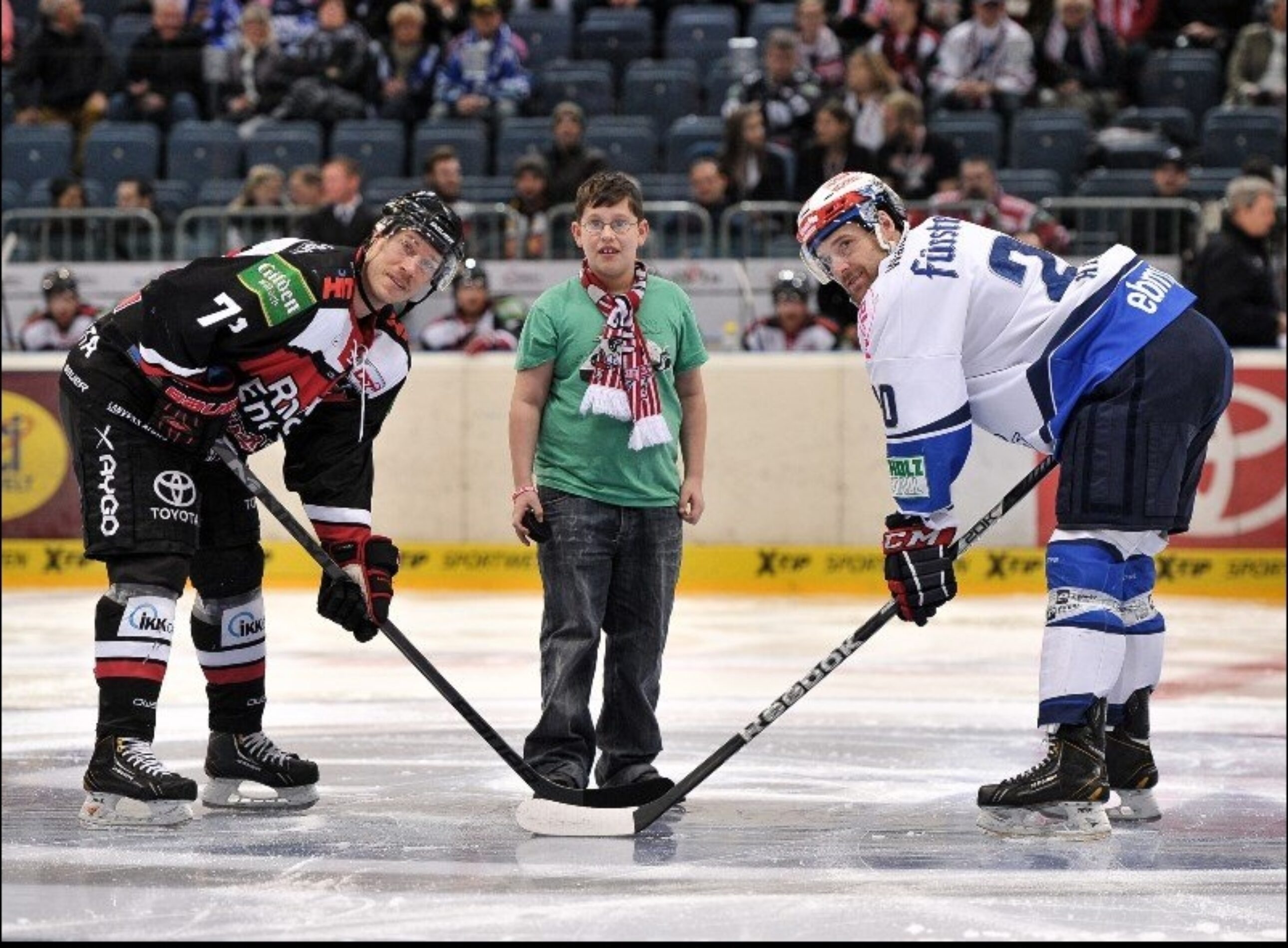 Lennart Schmidt und Leif Eric Steinbach, beide von der Pestalozzi-Schule in Altenkirchen hatten bei diesem Spiel ganz besondere Aufgaben: Lennart durfte in die Rolle des Sharky-Betreuers schlümpfen, Leif Eric den Puck zum Eröffnungs-Bully aufs Eis bringen.