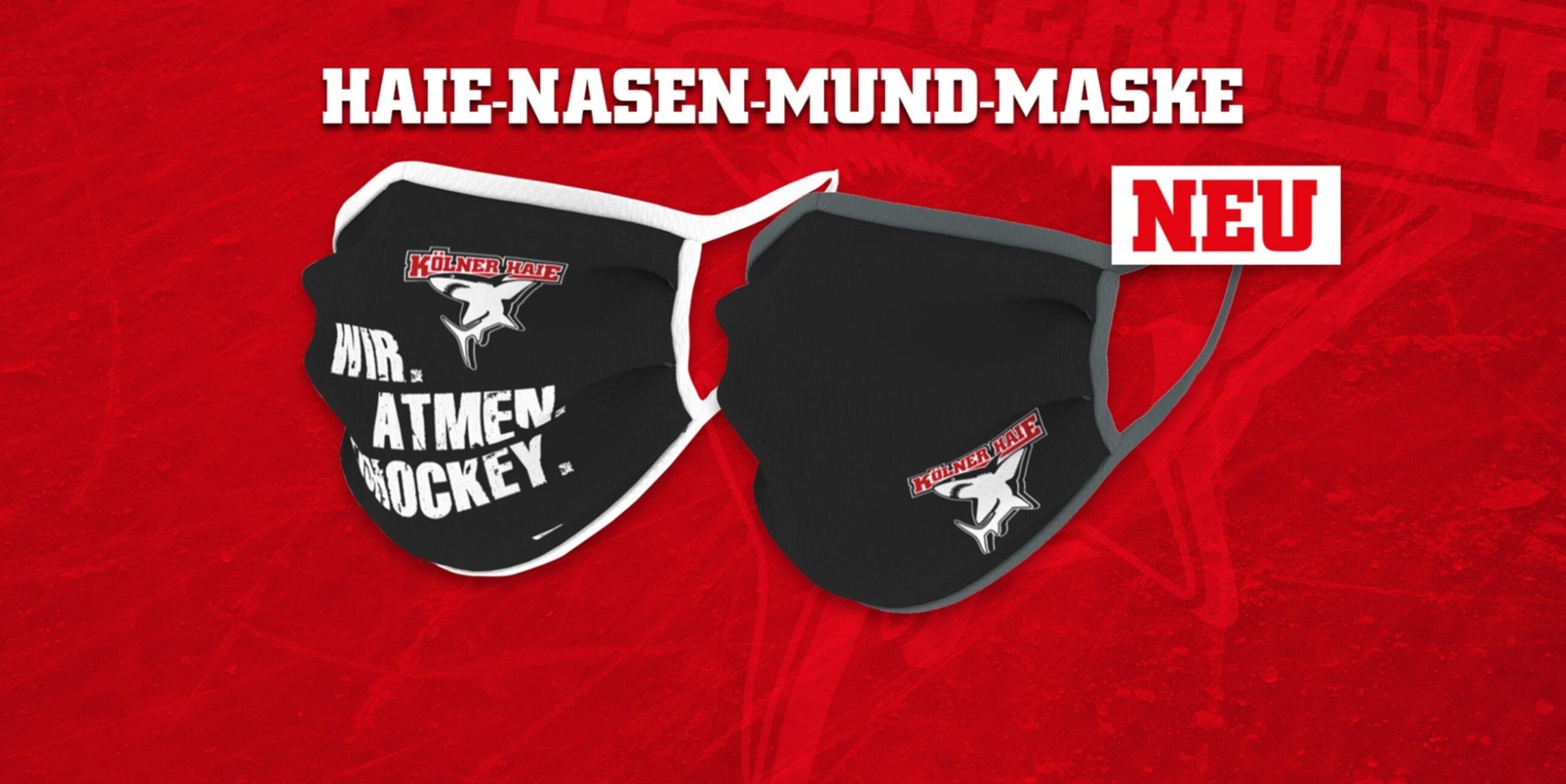 Gleich zwei stylische Masken-Modelle haben die Kölner Haie für Euch im Angebot: So kann der Fan zwischen der Nasen-Mund-Maske LOGO und der Maske WIR ATMEN EISHOCKEY wählen. Schon jetzt sind die waschbaren Haie-Masken aus OEKO-TEX-zertifizierten Materialien ein echter Verkaufs-Hit. So sind online bereits über 8.000 Bestellungen eingegangen. Die Masken werden entsprechend der Verfügbarkeit von uns schnellstmöglich verschickt. Deshalb bitten wir Euch von Fragen bezüglich des zeitlichen Versands abzusehen.
