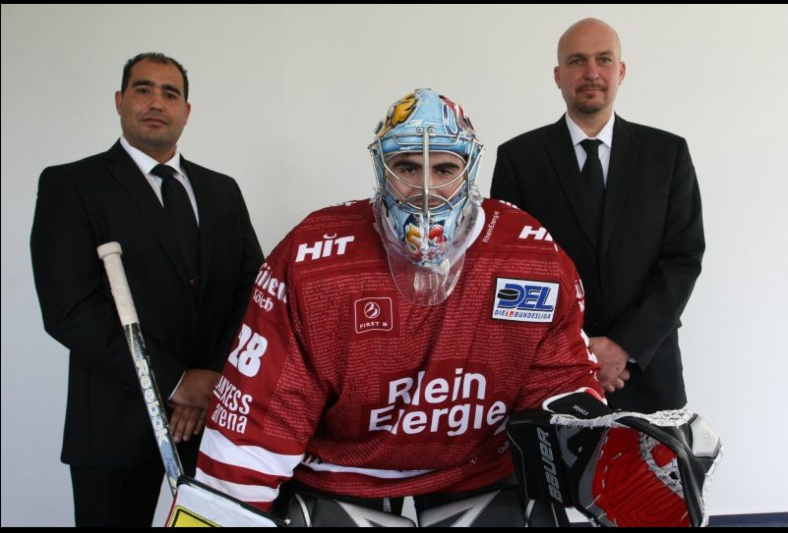 Sie stehen für Sicherheit: Auf der einen Seite der neue KEC-Torwart Adam Dennis, der den Haie-Kasten beschützt, auf der anderen Geller Security. Der neue Haie-Partner arbeitet ab dieser Saison mit dem KEC zusammen und hat die Spielerpatenschaft für Adam Dennis übernommen. Das Unternehmen von Geschäftsführer Babak Geller beschäftigt 150 Mitarbeiterinnen und Mitarbeiter u.a. in den Bereichen Objekt-, Personen- und Veranstaltungsschutz. Ihren Hauptsitz haben die Sicherheitsexperten seit vier Monaten in Köln-Weiden. Mitte der Woche stattete Adam Dennis dem KEC-Partner einen Besuch ab.
