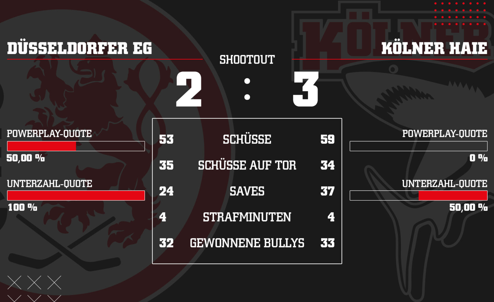 Im Schlussdrittel spielten beide Mannschaften weiter auf Sieg. Während uns die Anfangsphase eines intensiven Schlussdrittels gehörte, kamen die Hausherren zum Ende der letzten regulären 20 Minuten etwas mehr auf. Da beide Torhüter aber nicht mehr überwunden werden konnten, ging es nach 60 Minuten in die Overtime, in welcher sich das gleiche Bild bot. Uns gehörten die ersten Szenen der Verlängerung, die DEG war zum Ende hin dem Siegtreffer näher. Da dieser trotz guter Möglichkeiten auf beiden Seiten aber nciht nicht fallen sollte, musste das Penaltyschieen für die Entscheidung herhalten.