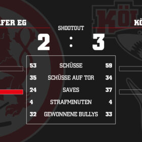 Und hier hatten wir die Nase vorn! Während Kammerer und Schütz für uns trafen, konnte Ancicka die beiden ersten Versuche der Gäste abwehren, sodass wir um kurz nach 18:30 Uhr an diesem schönen Abend als Derbysieger feststanden. Den Sieg feierte unsere Mannschaft ausgiebig vor der vollen KEC-Kurve und drehte dabei eine kleine Ehrenrunde – diese hatten sich die Jungs nach dieser Partie, in der sie alles reinworfen aber auch verdient. Genauso wie die mitgereisten 1.200 Haie-Fans!