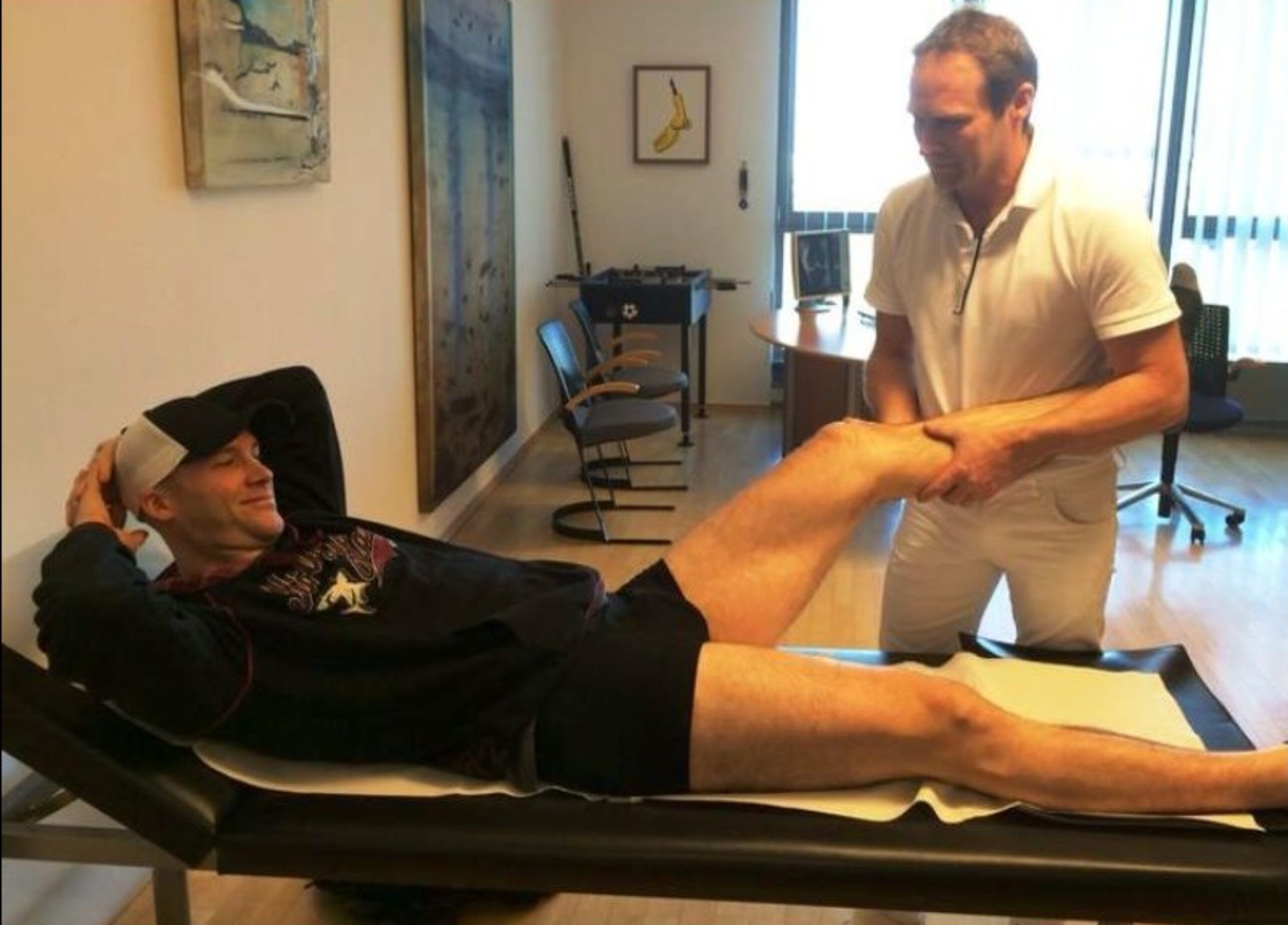 Glück im Unglück für Charlie Stephens. Der Haie-Stürmer musste das Heimspiel gegen Iserlohn am Dienstag verletzungsbedingt frühzeitig beenden. Am Mittwoch wurde er in der MediaPark Klinik (im Bild rechts Dr. Thomas Stock) eingehend untersucht. Eine schwerwiegende Knieverletzung konnte ausgeschlossen werden.