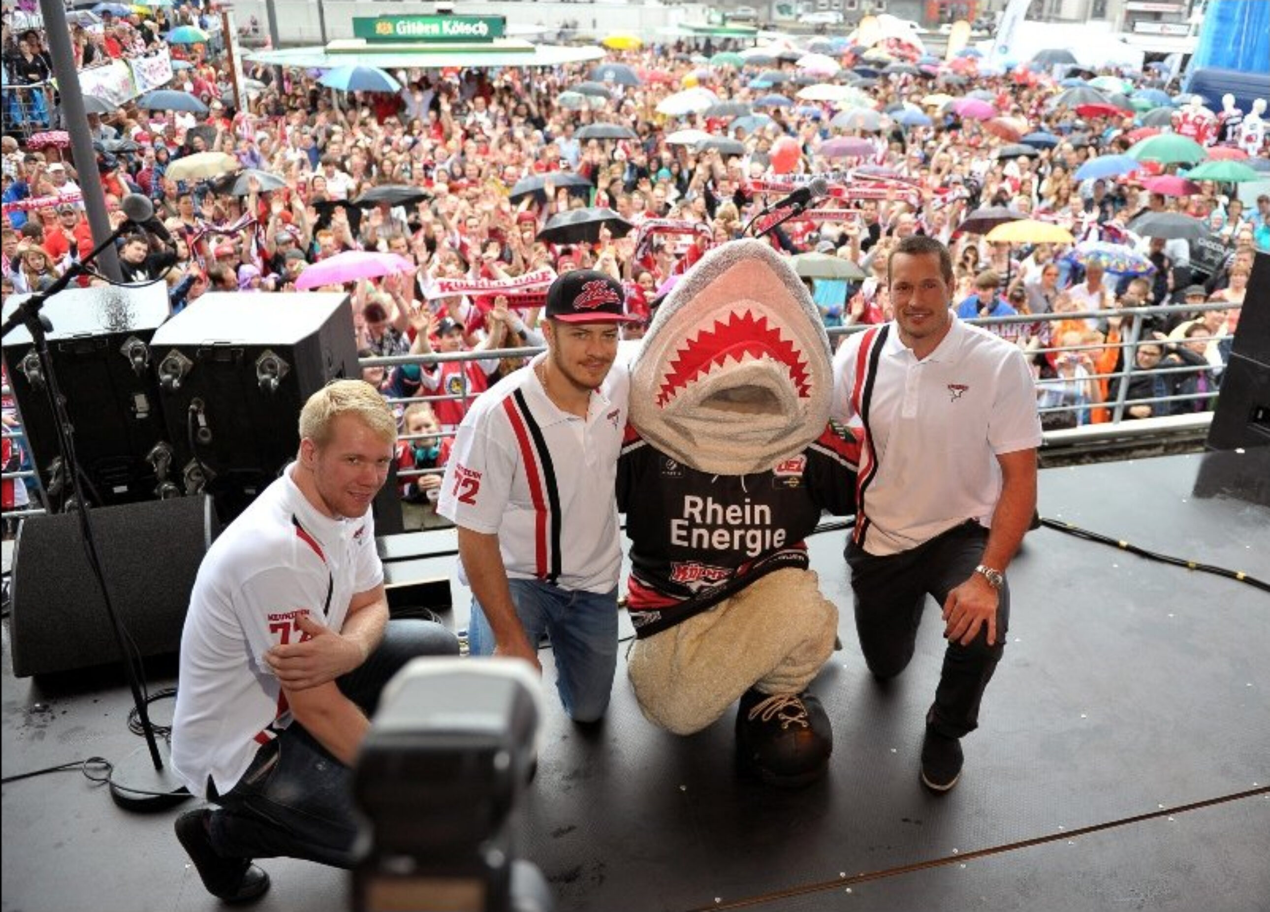 Janine Breuer-Kolo sprach den Haie-Fans aus dem Herzen: „In dieser Saison macht uns nur das Wetter nass!“ Radio Kölns Morgenstimme, die beim Haie-Sommerfest am Sonntag die Moderation auf der TOYOTA-Bühne übernommen hatte, lie sich wie Tausende Fans am Schokoladenmuseum die gute Stimmung durch ein paar Regenschauer nicht verderben. Fans, Besucher und Haie-Mannschaft erlebten ein rundum gelungenes Sommerfest – auch wenn Petrus an diesem Tag scheinbar DEG-Fan war.