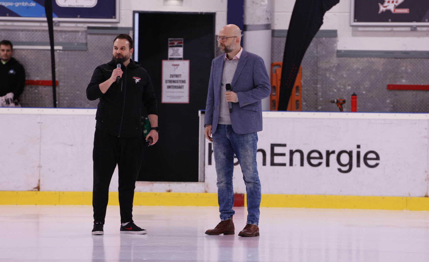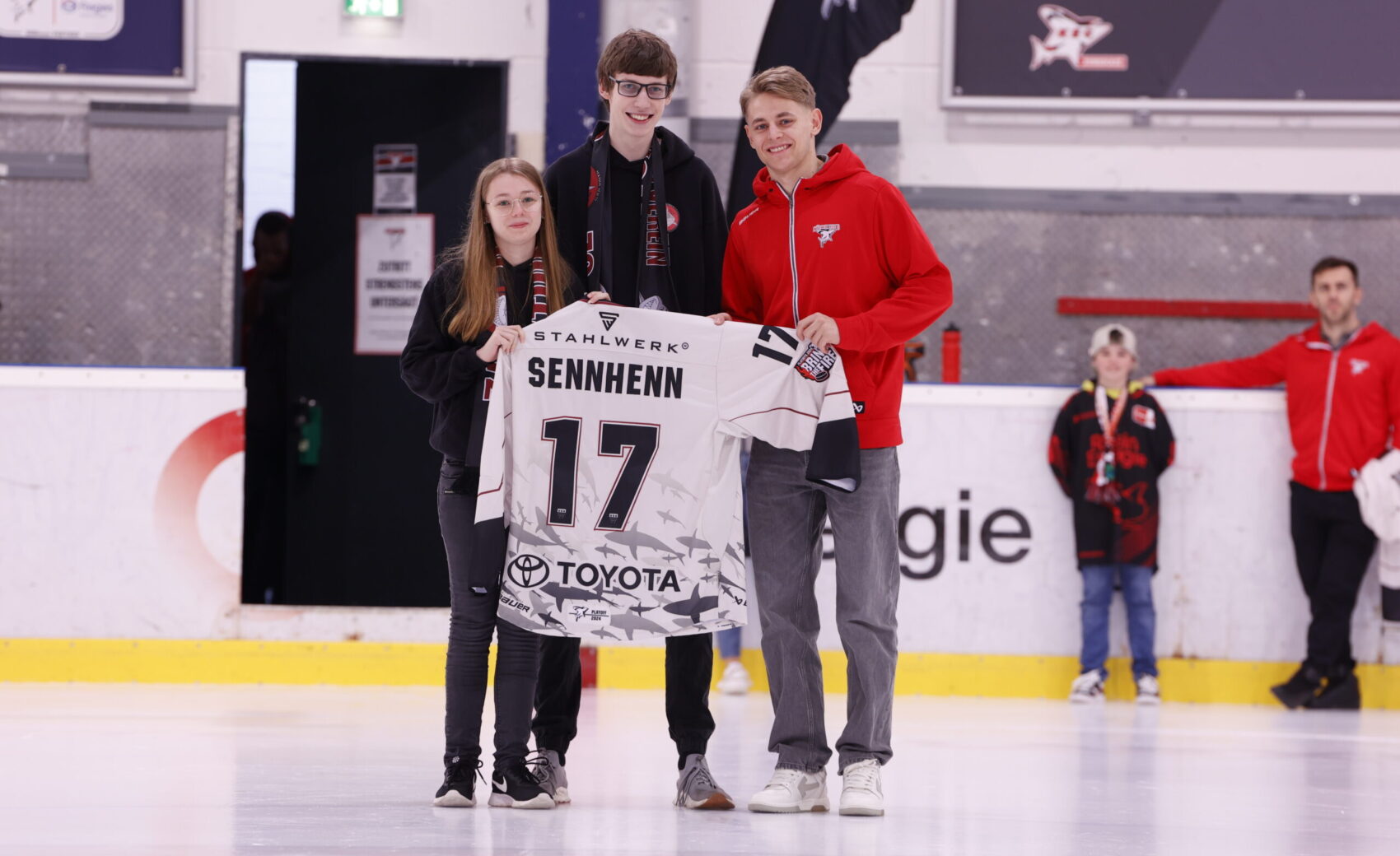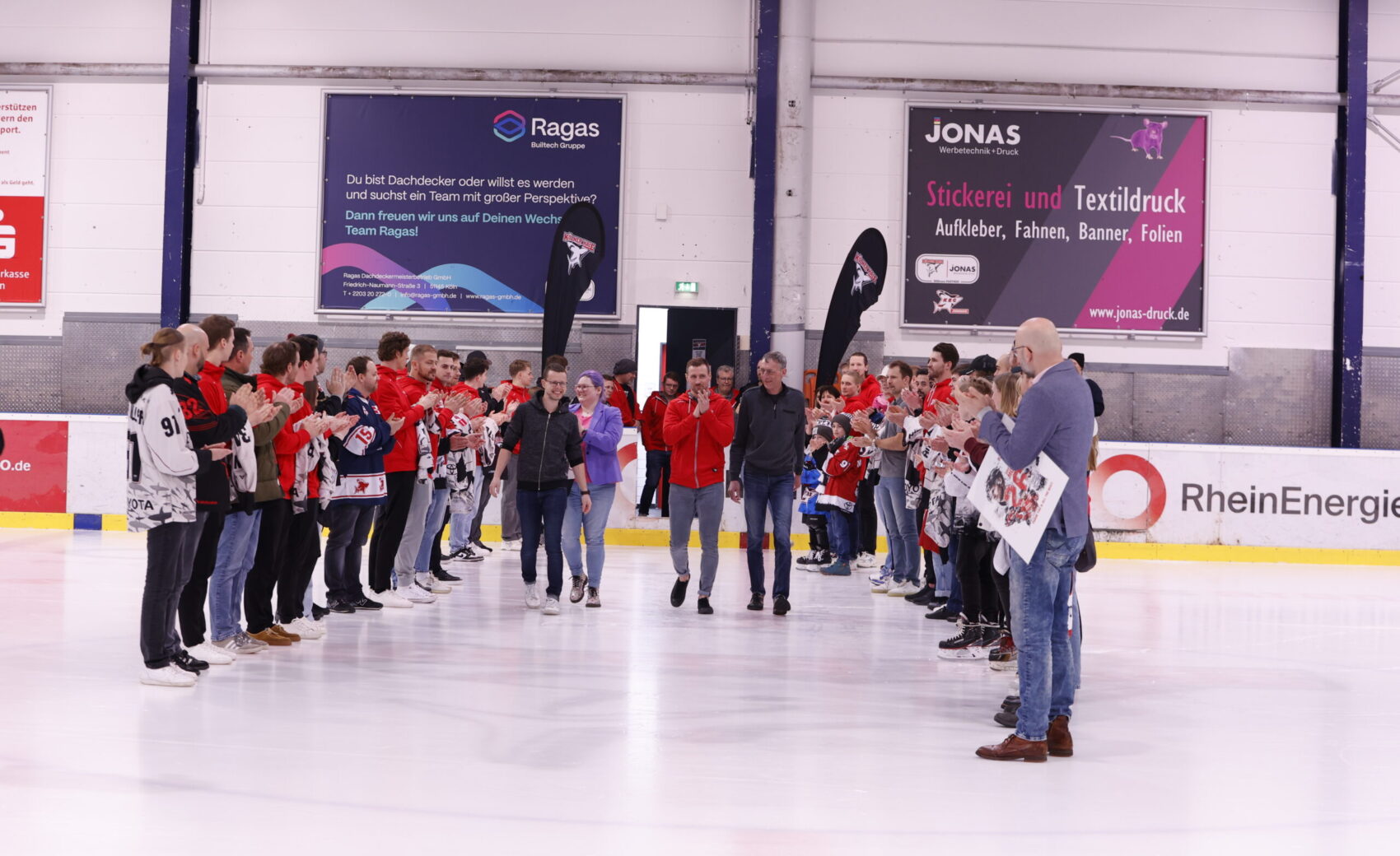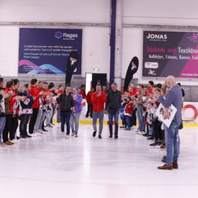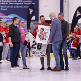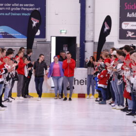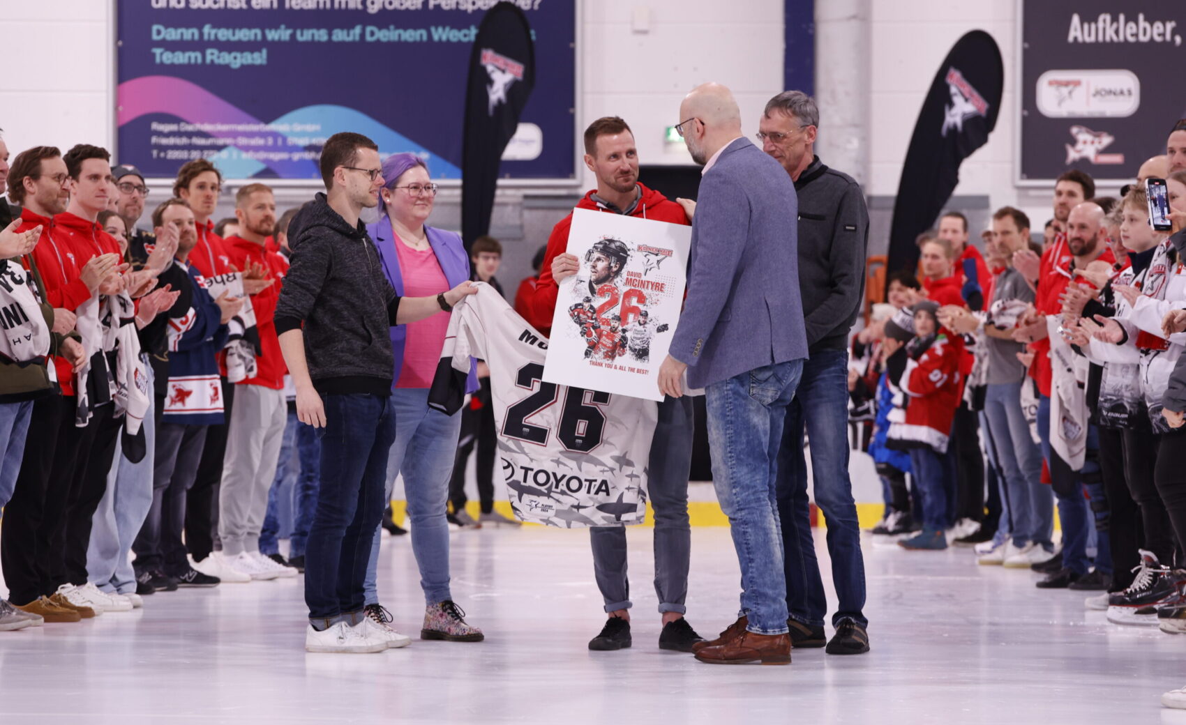 Würdevoll war die Verabschiedung auch deswegen, weil das Haie-Zentrum rappelvoll war und der Applaus, als Geschäftsführer Philipp Walter David McIntyre eine Collage überreichte, ordentlich laut war. Im Anschluss daran wurde das Eis „eröffnet“, sodass alle, die Lust hatten, auf der Trainingsfläche unserer Mannschaften Schlittschuh laufen konnten – darunter mischten sich auch viele unserer Spieler, wodurch schöne Bilder entstanden.