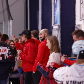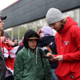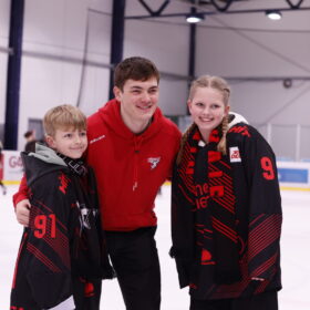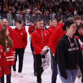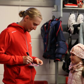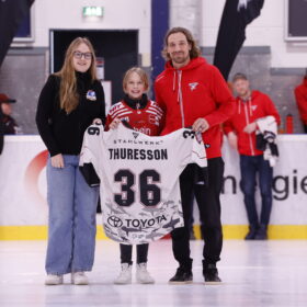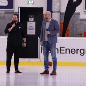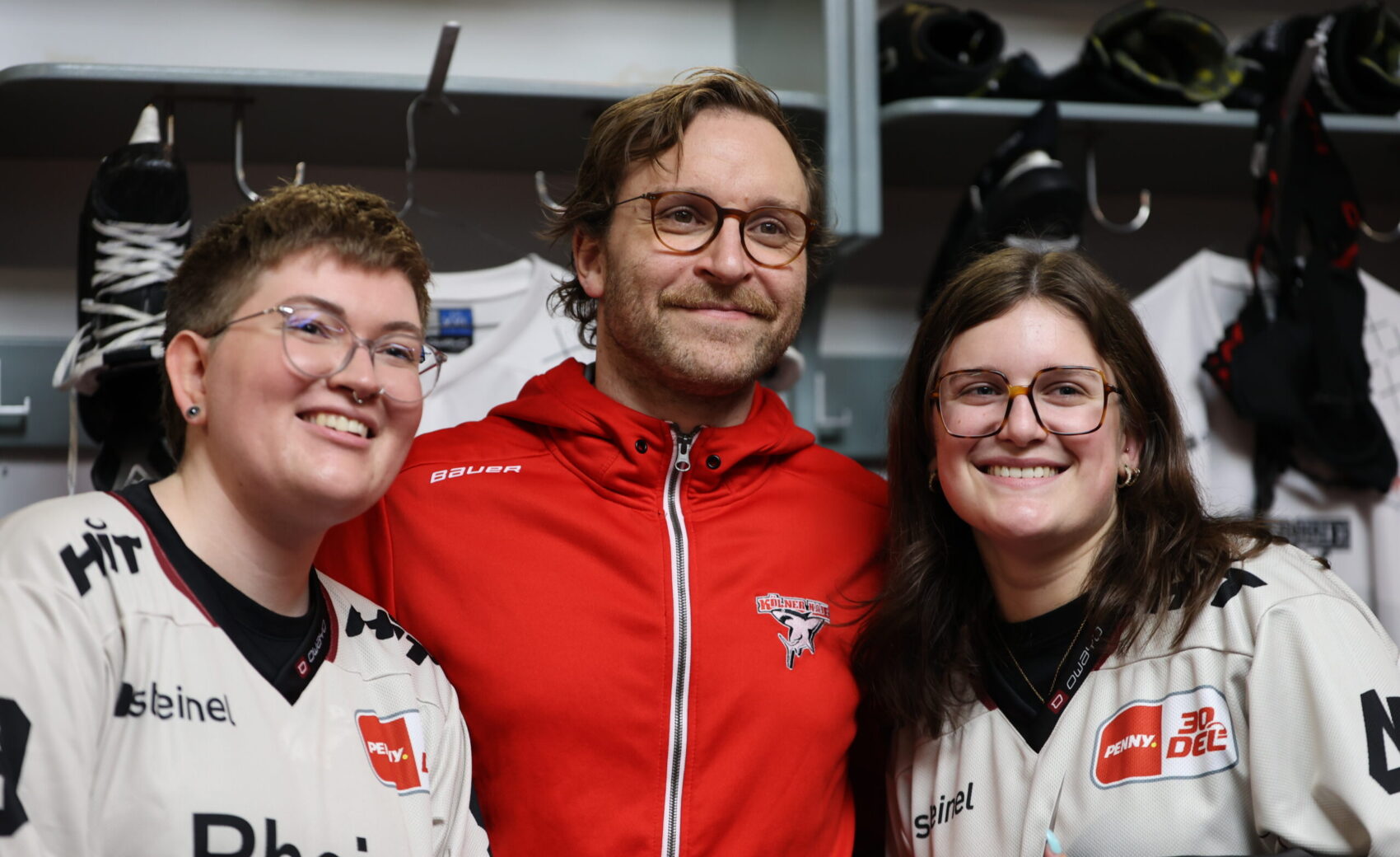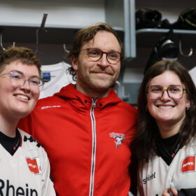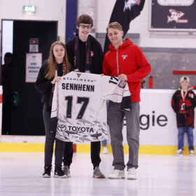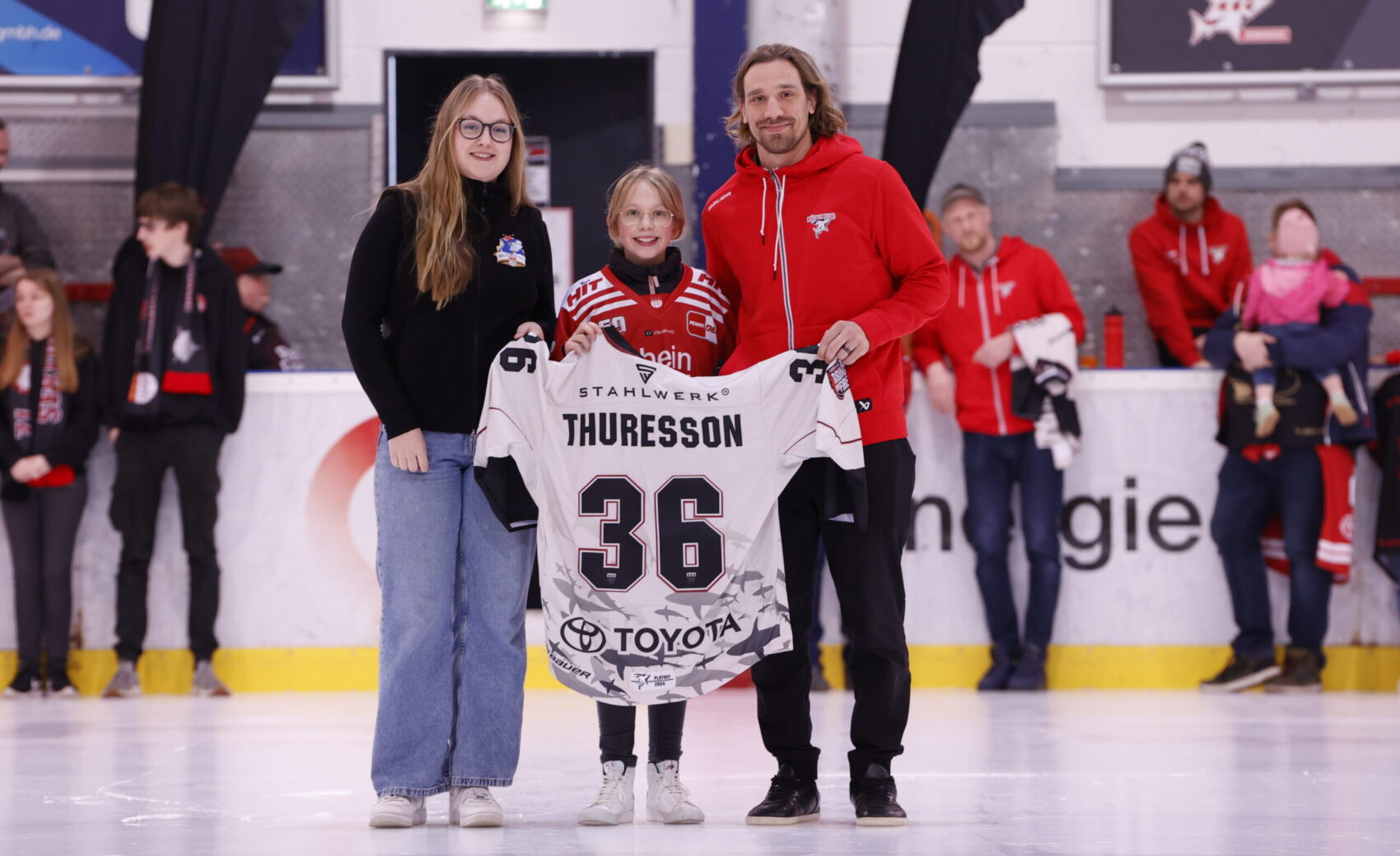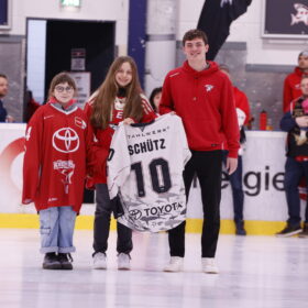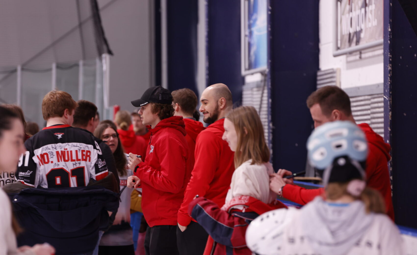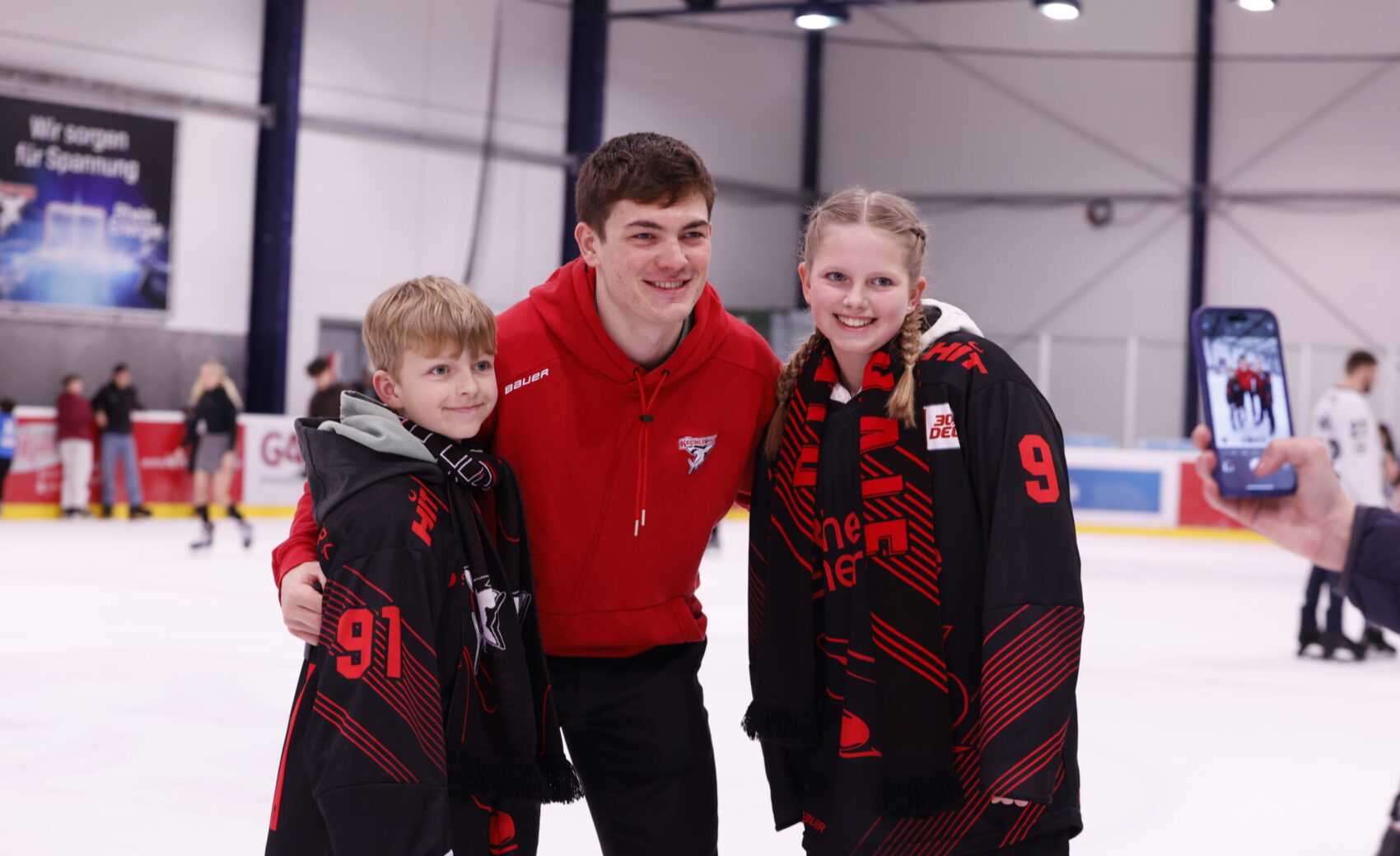 Würdevoll war die Verabschiedung auch deswegen, weil das Haie-Zentrum rappelvoll war und der Applaus, als Geschäftsführer Philipp Walter David McIntyre eine Collage überreichte, ordentlich laut war. Im Anschluss daran wurde das Eis „eröffnet“, sodass alle, die Lust hatten, auf der Trainingsfläche unserer Mannschaften Schlittschuh laufen konnten – darunter mischten sich auch viele unserer Spieler, wodurch schöne Bilder entstanden.