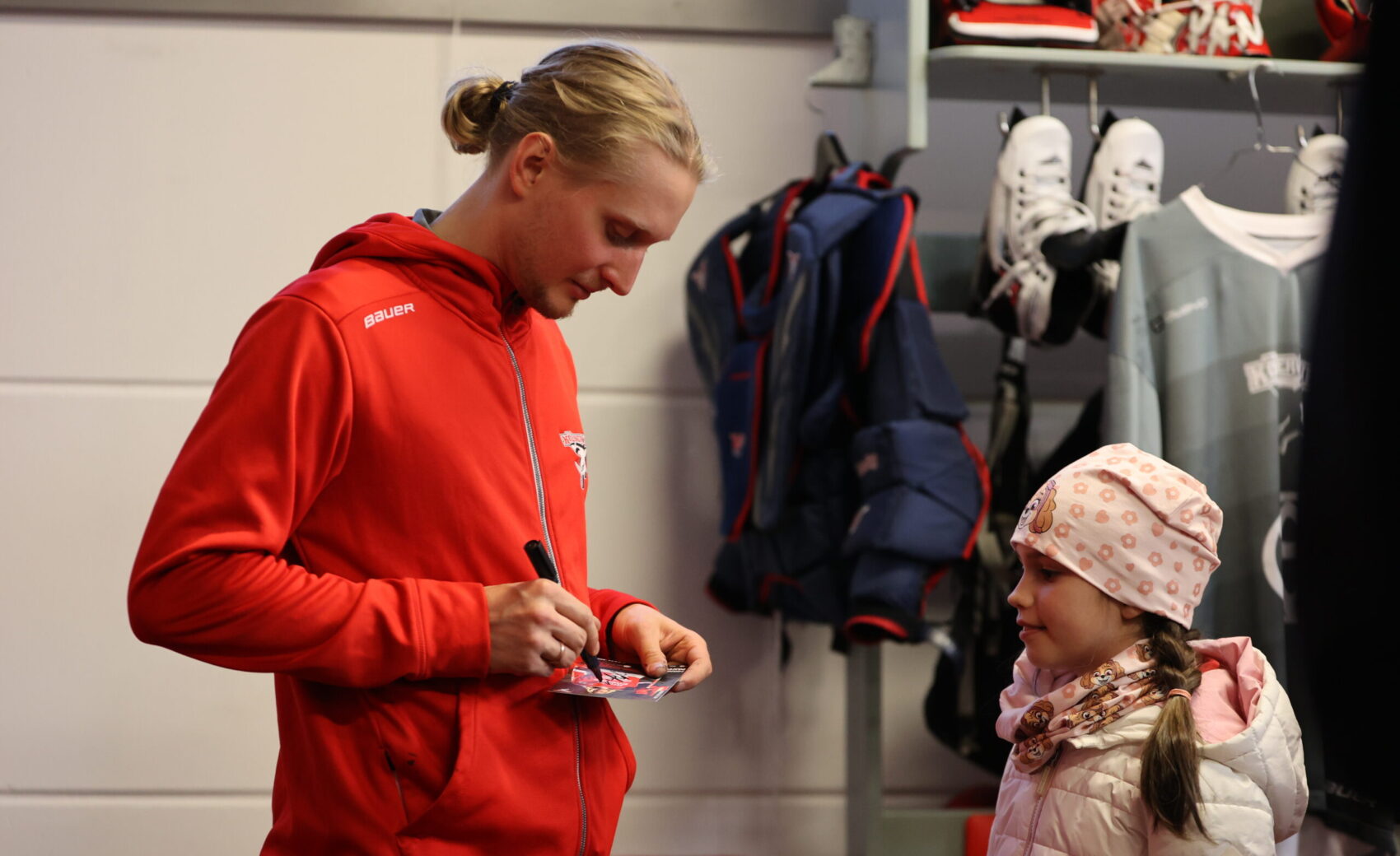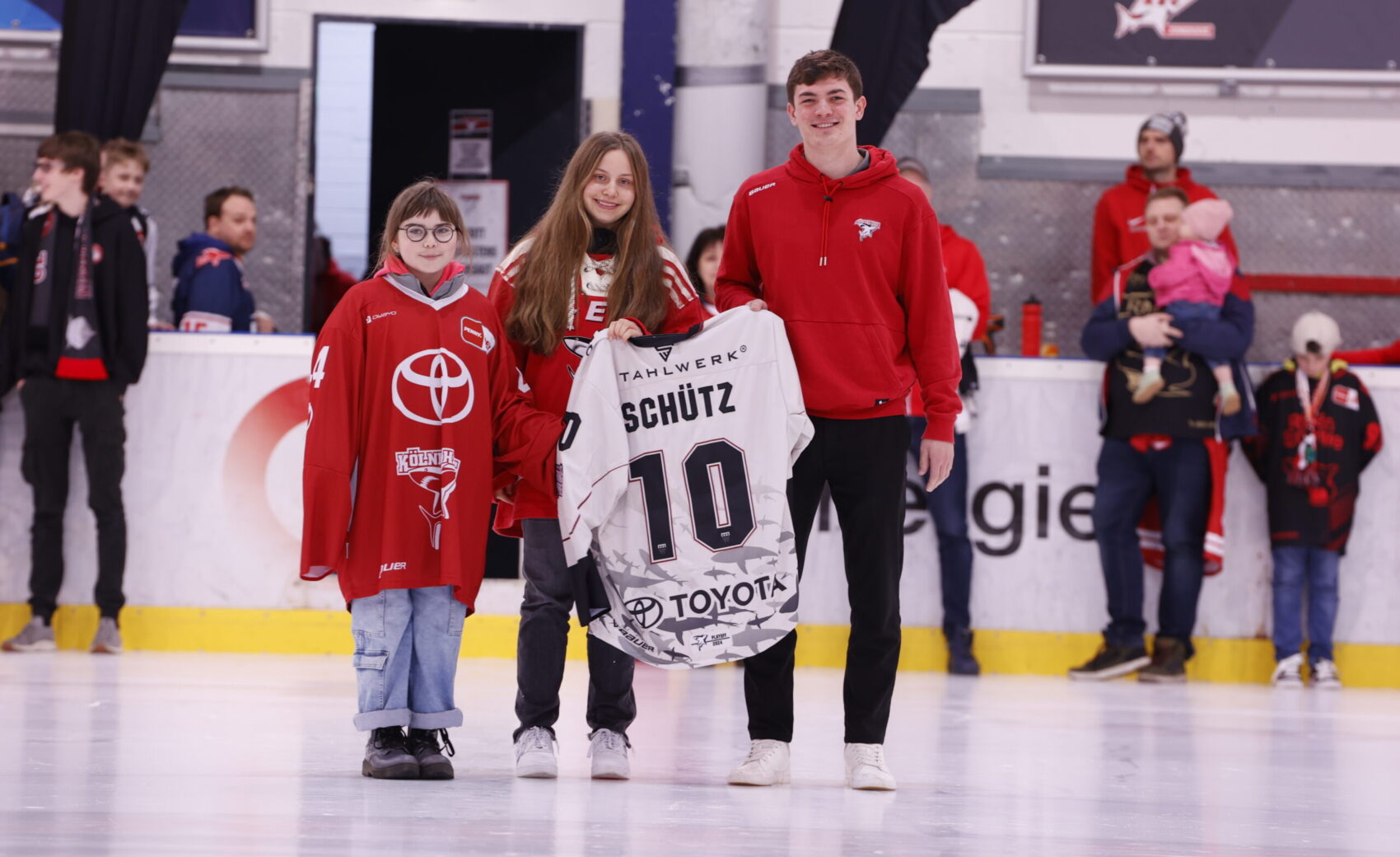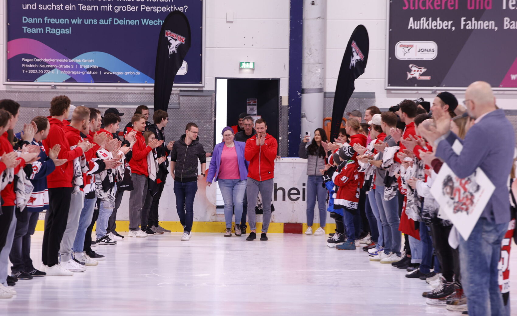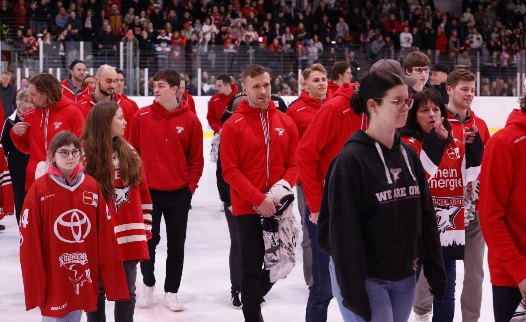 Um kurz vor 14:00 Uhr wurde es emotional im Haie-Zentrum. Zur traditionellen Übergabe der Trikots an jeden KEC-Spieler der Saison 2023/2024 kam David McIntyre bewusst als Letzter auf das Eis. Rasch bildeten alle Akteure auf der Spielfläche – Spieler, Fanclubvertreter, Haie-Vertreter – ein Spalier und gaben der offiziellen Verabschiedung von unserem Assistenzkapitän damit einen würdigen Rahmen. McIntyre hatte vor kurzem seine Karriere beendet.