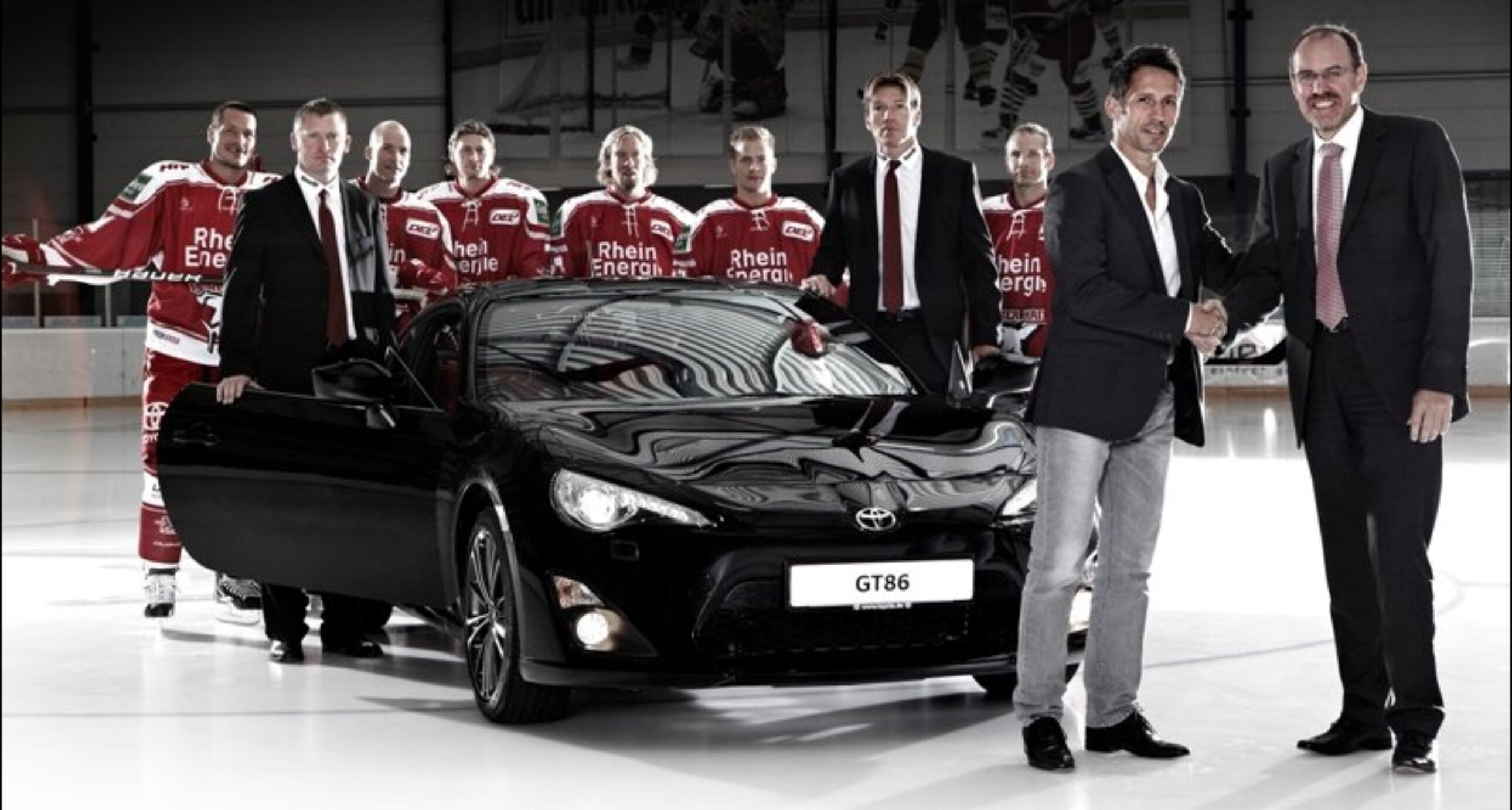 Beschlossen war es schon länger, dass der KEC und Toyota Partner bleiben. Jetzt wurde die Verlängerung der Partnerschaft für die Jubiläumssaison 2012/2013 und mindestens eine weitere Saison auch bildlich in Szene gesetzt. Umrahmt von den Haie-Stars John Tripp, Charlie Stephens, Andreas Holmqvist, Daniel Tjärnqvist, Moritz Müller, Mirko Lüdemann sowie den Coaches Uwe Krupp und Niklas Sundblad trafen sich Thomas Eichin und Frank Gründler, der General Manager Marketing bei Toyota, auf dem Haie-Eis zum symbolischen Händedruck. Passend zur leidenschaftlichen Verbindung zwischen KEC und Toyota rundete der neue Sportwagen GT86 das Bild ab.