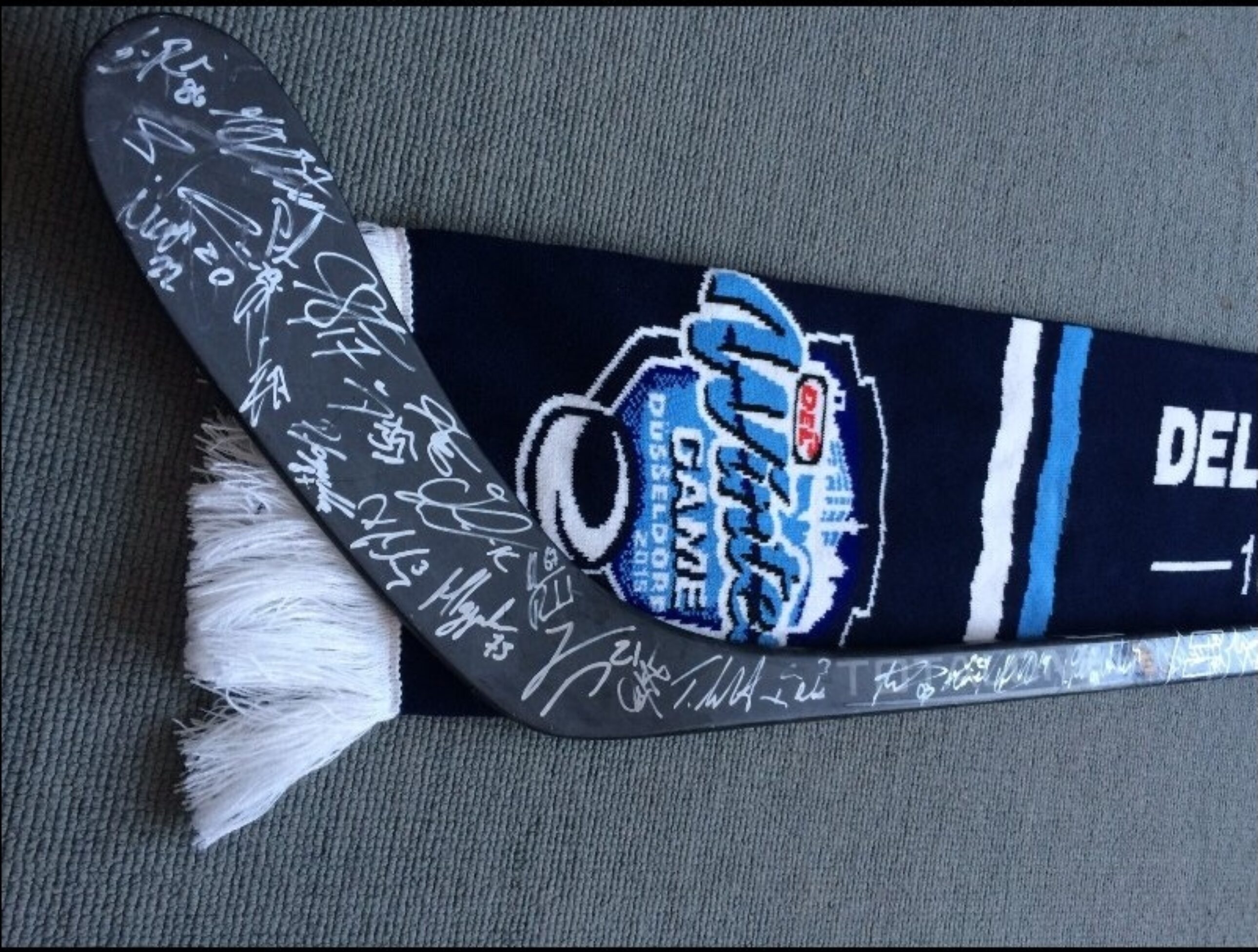 Für seine Tripp-Charity hat John Tripp heute wieder einen ganz besonderen Preis dabei: Dieses Mal gibt es einen im Winter Game gespielten Original-Schläger samt Schal vom Haie-Kapitän zu gewinnen. Der Schläger ist von allen Spielern der Haie und der DEG unterschrieben. Lose (2,- Euro) gibt es u.a. am Info-Counter-Nord.