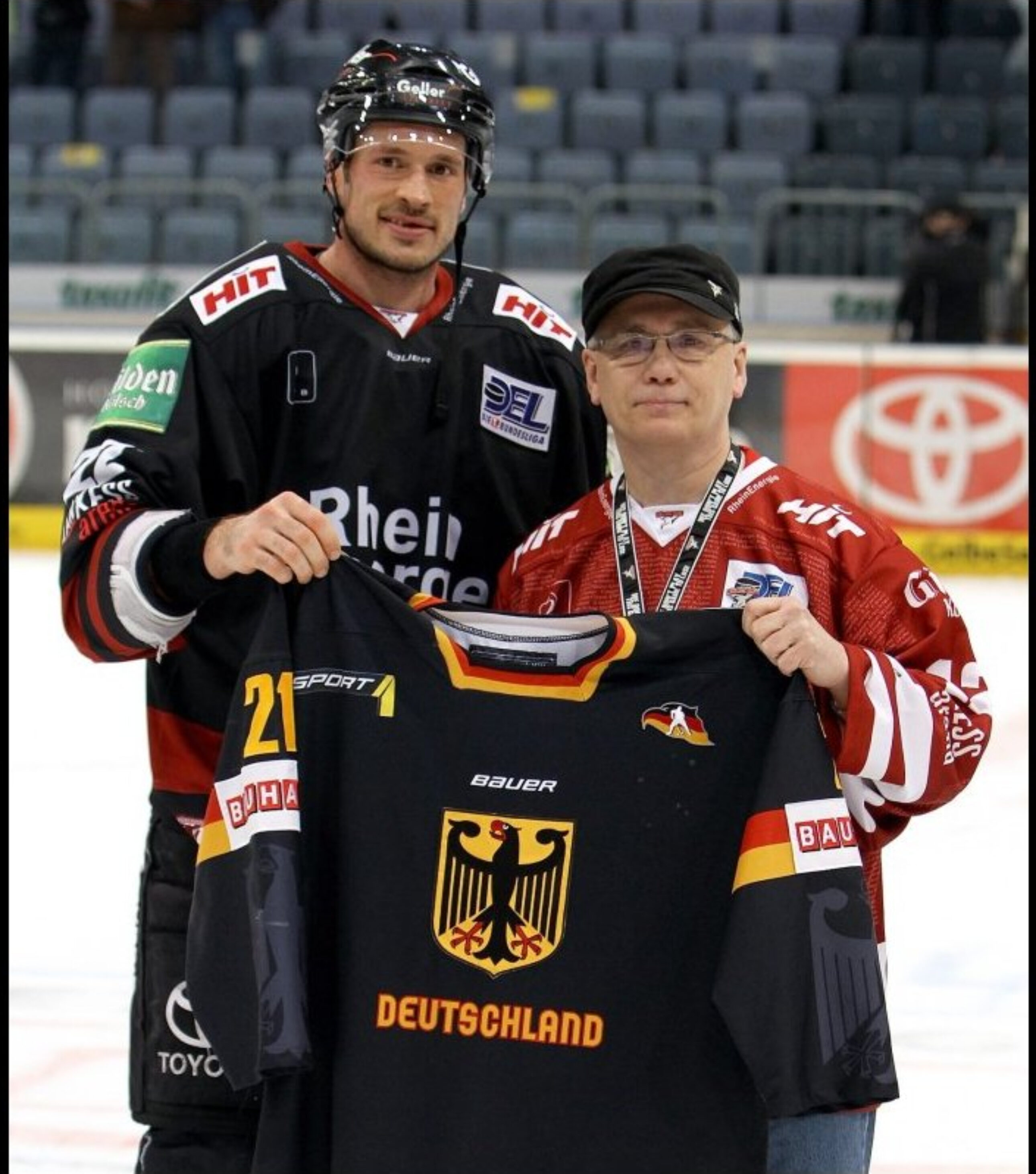 Ludolf Kruse durfte sich trotz der Niederlage gegen München freuen. Er hatte die Tripp-Charity, die krebskranken Kindern hilft, durch eine Spende unterstützt – und gewonnen. Der Haie-Fan erhielt das Deutschland-Trikot des Charity-Gründers persönlich überreicht.
