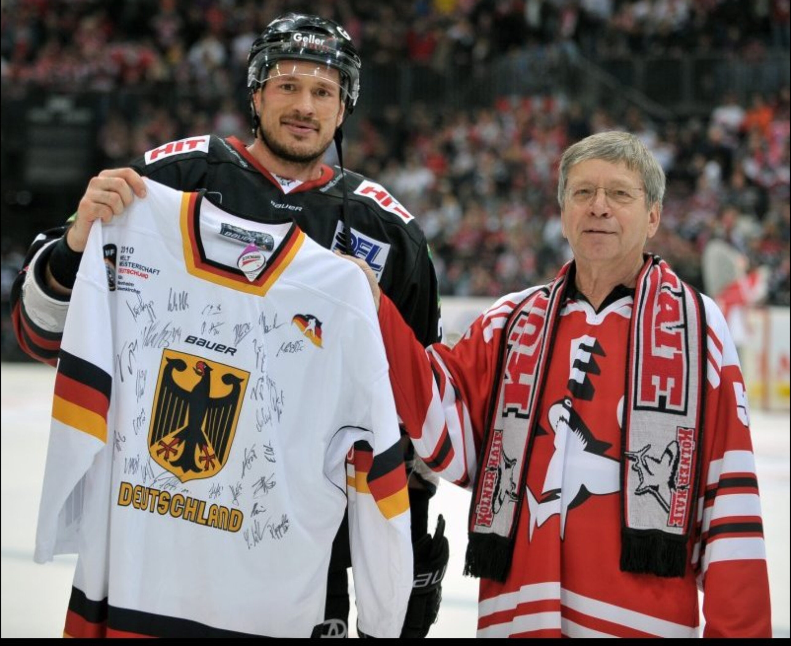 Karl-Heinz Nitzsche fieberte bis zum Schluss mit, freute sich wie alle Haie-Fans über den 5:0-Sieg des KEC über Iserlohn. Doch damit war der Abend für ihn noch lange nicht zu Ende. Karl-Heinz Nitzsche hatte sich wie viele Zuschauer bei der Tripp-Charity engagiert und Geld für krebskranke Kinder gespendet. Alle Fans, die in der Arena mindestens € 2,- spenden, konnten etwas gewinnen. Diesmal: Ein signiertes Deutschland-Trikot. Karl-Heinz Nitzsche war der glückliche Gewinner. John Tripp übergab das Jersey direkt nach dem Spiel auf dem Eis.