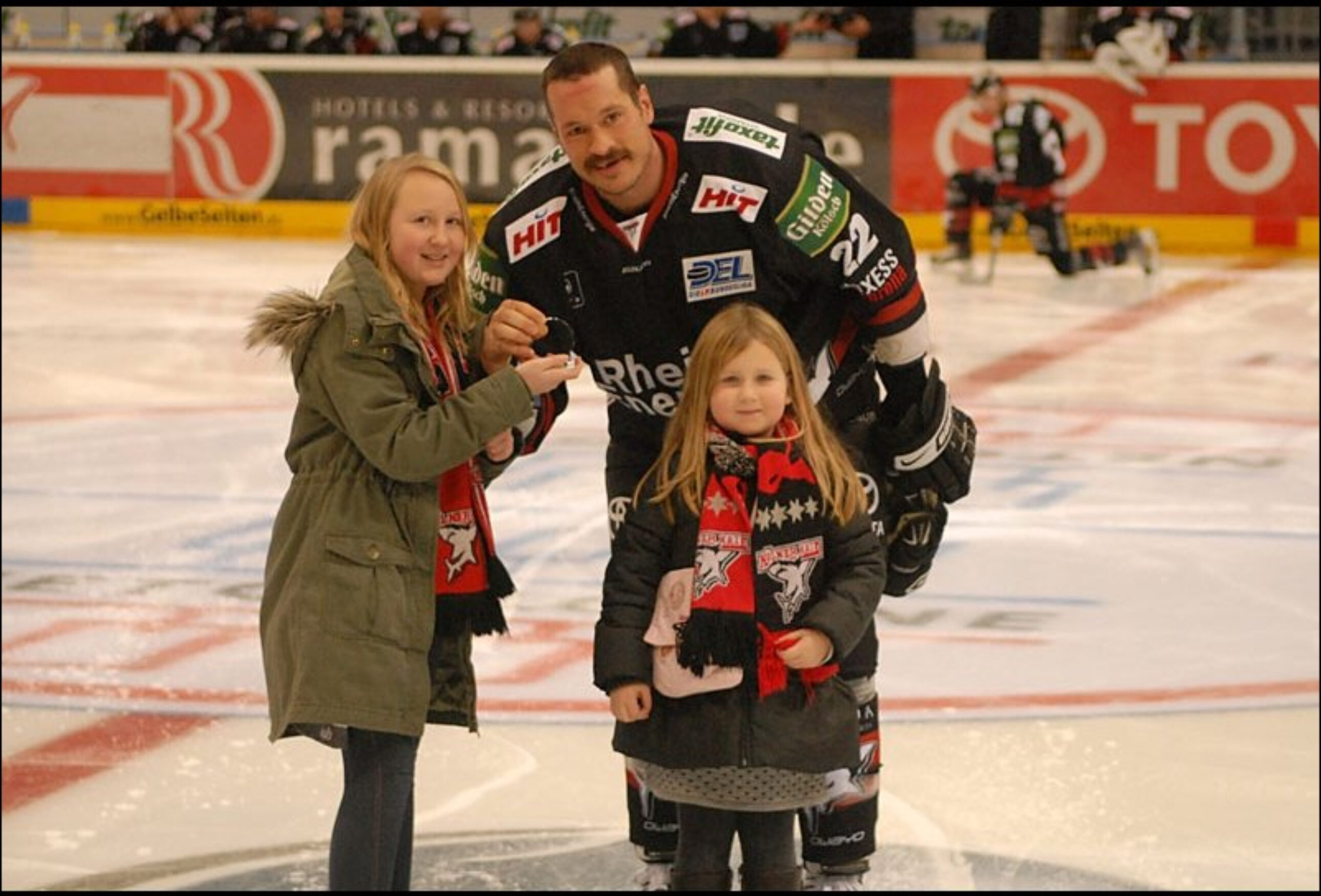 Die Siegermedaille für Tripp wurde von den kleinen Haie-Fans Leona und Greta Raffelsiefen vor dem Heimspiel gegen Nürnberg souverän übergeben.