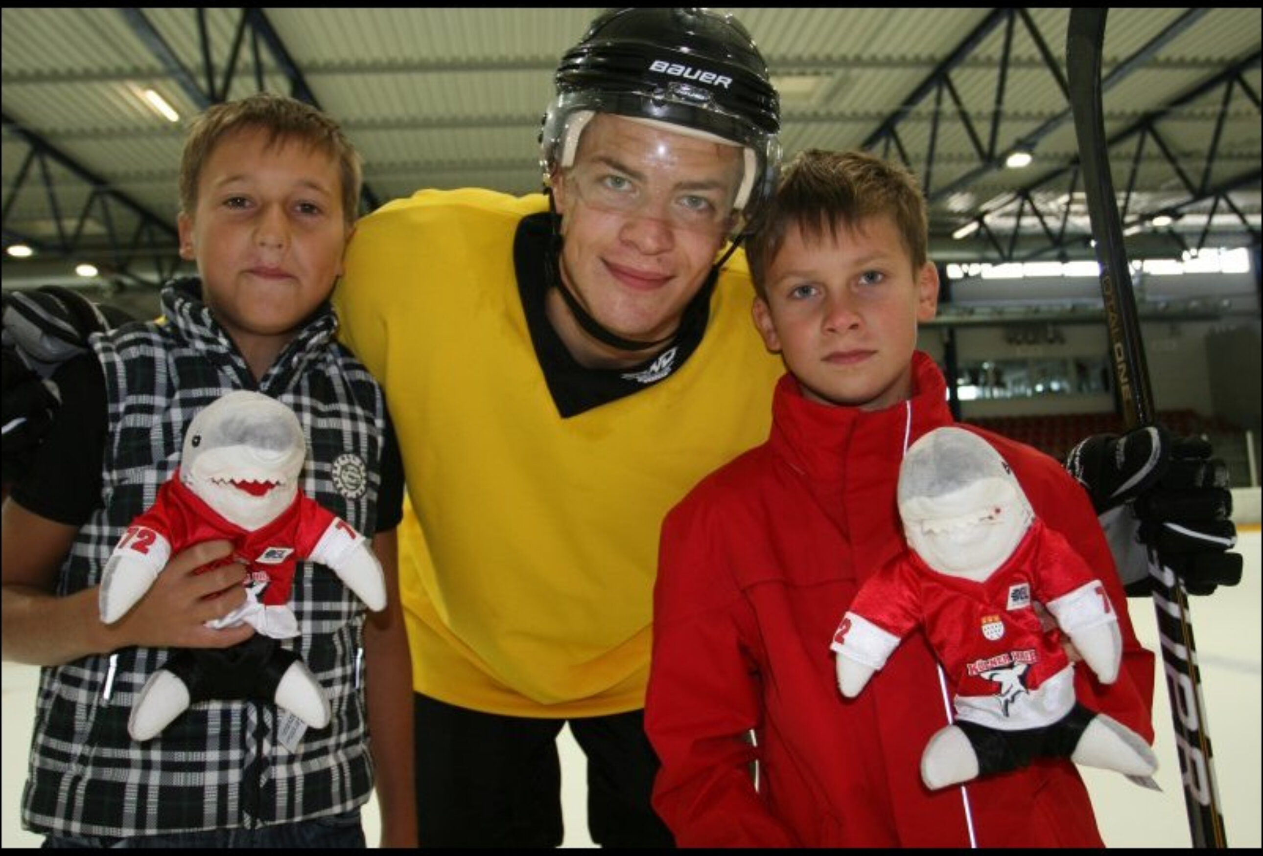 Am Freitag hatte der KEC besondere Trainingsgäste. Arsenij (11) und Vlad (12) aus der Nähe Tschernobyls statteten den Haien gemeinsam mit ihren Kölner Gasteltern einen Besuch ab, verfolgten die Trainingseinheit auf dem Eis und wurden danach von Haie-Verteidiger Moritz Müller begrüt, Autogramme und Sharky-Geschenk inklusive. Moritz überraschte die Ehrengäste sogar mit ein paar russischen Sätzen.