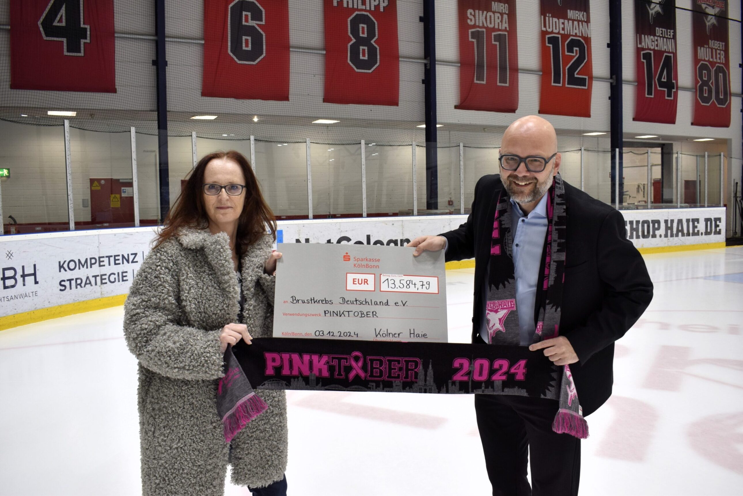 Haie-Geschäftsführer Philipp Walter übergab Inge Günnink, Leiterin Regionalvertretung NRW des Brustkrebs Deutschland e.V., heute im Haie-Zentrum den groen Spendenscheck.