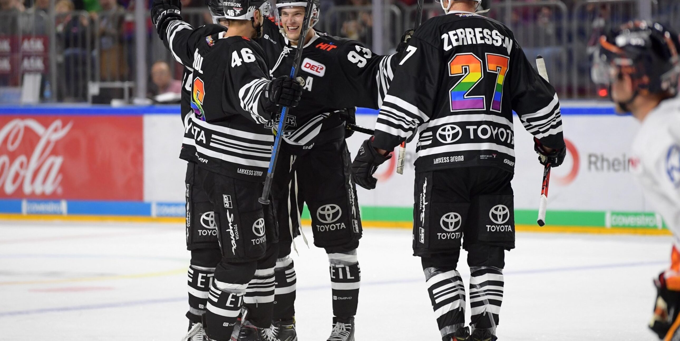 Auch im Schlussabschnitt zeigt sich der KEC offensivfreudig, spielt mit Zug zum Tor, zunächst allerdings ohne das Wolfsburger Tor zu gefährden. In der 45. Minute ändert Jakub Kindl das: Nach einer schönen Passstafette wird der Tscheche freigespielt und zieht direkt ab, zielt aber etwas zu zentral auf den Kasten von Chet Pickard. Nur wenige Augenblicke später ist es wieder Kindl, diesmal schiet er über die Querlatte – Pech für die Haie. Aber auch auf der anderen Seite kann sich Gustaf Wesslau auszeichnen. Nach einem Konter reit er blitzschnell die Fanghand hoch, nachdem Anthony Rech zum Abschluss gekommen war (47.). Aber die Haie bleiben konzentriert. Als die Wolfsburger dann aber den Torhüter vom Eis nehmen, flutscht doch noch ein Schuss durch, Ryan Button verkürzt für die Grizzlys (58). Doch 12 Sekunden vor Schluss windet sich Sebastian Uvira um seinen Gegenspieler und trifft aus spitzem Winkel zum verdienten 4:2 für die Haie – sein dritter Treffer am Abend. „Es war ein Wahninns-Gefühl. Mein erster DEL-Hattrick. Ich hab’s extrem genossen mit den Fans zu feiern. Um so wichtiger, dass wir das Spiel dann auch noch gewonnen haben.“ Für zwei Akteure war dieser 27. September ein ganz besonderer Abend – und das hatte nichts mit dem Ergebnis zu tun. Haie-Verteidiger Pascal Zerressen feierte seinen 400. Einsatz in der DEL. Und auch auf Wolfsbuger-Seite gab es mit Sebastian Furchner einen Jubilar. Der frührer Kölner und heutige Grizzlys-Kapitän knackte in Köln als fünfter Spieler in der Geschichte der DEL die 1.000er-Marke. Beide Spieler wurden vor der Partie auf dem Eis mit entsprechenden Jubiläums-Trikots geehrt. So war es in jeglicher Hinsicht ein runder Abend.