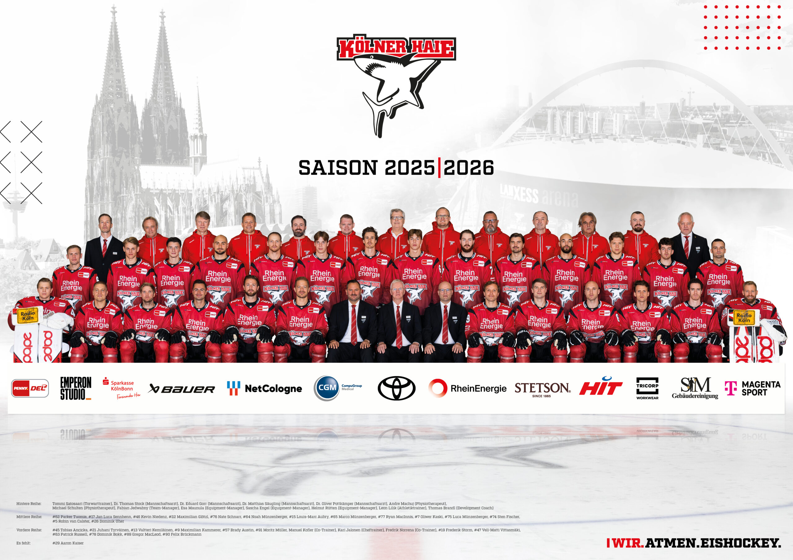 Mittlere Reihe (v.l.): #62 Parker Tuomie, #17 Jan Luca Sennhenn, #46 Kevin Niedenz, #22 Maximilian Glötzl, #76 Nate Schnarr, #64 Noah Münzenberger, #15 Louis-Marc Aubry, #65 Marco Münzenberger, #77 Ryan MacInnis, #7 Oliwer Kaski, #75 Luca Münzenberger, #74 Sten Fischer, #5 Robin van Calster, #26 Dominik Uher