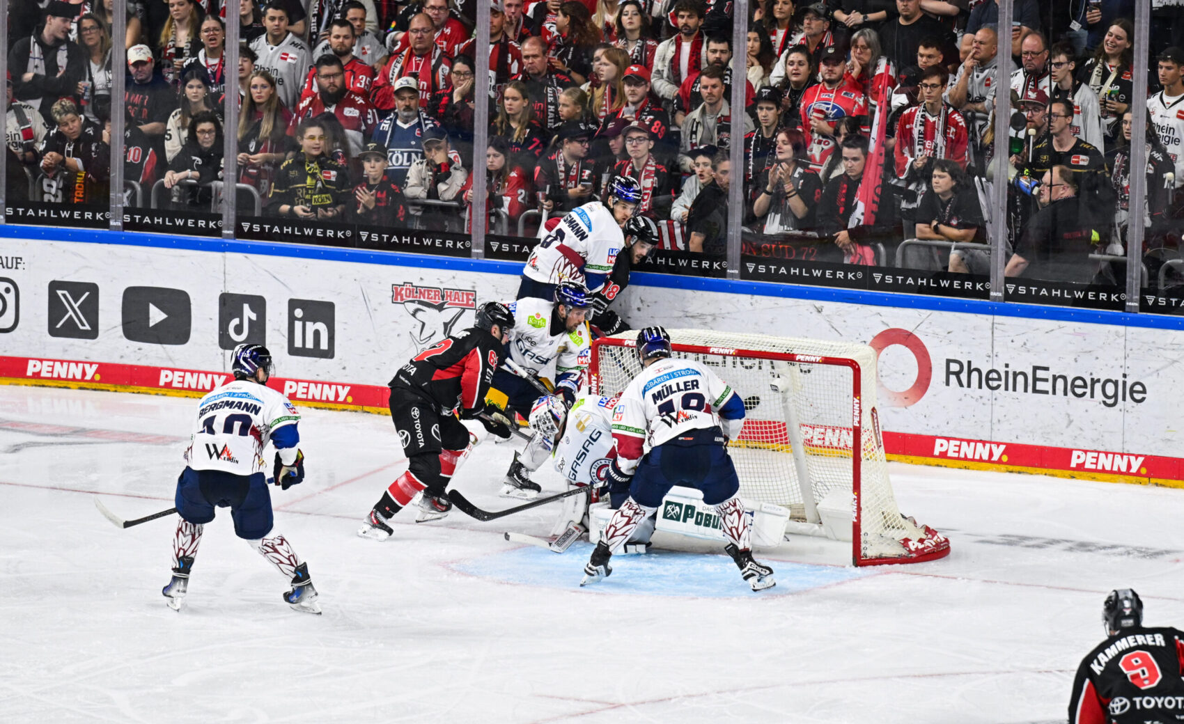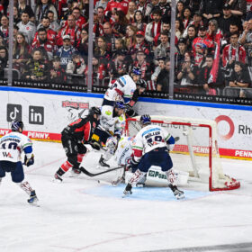 Auch im letzten Drittel spielten die Berliner weiterhin sehr konzentriert und abgezockt. Liam Kirk schoss in der 57. und 60. die Tore fünf und sechs für die Gäste, doch zwischen den beiden Treffern, konnte Marco Münzenberger für uns auf das zwischenzeitliche 2:5 stellen (59.). Nach einem guten Rückhandpass in den Lauf blieb der U20-Junghai bei seinem PENNY DEL-Debüt eiskalt vor Hildebrand und lie sich auch durch eine bereits angezeigte Strafe nicht aufhalten. Mit der Rückhand schoss der 19-Jährige sein erstes PENNY DEL-Tor, was auf der Bank und in der LANXESS arena gebührend gefeiert wurde.