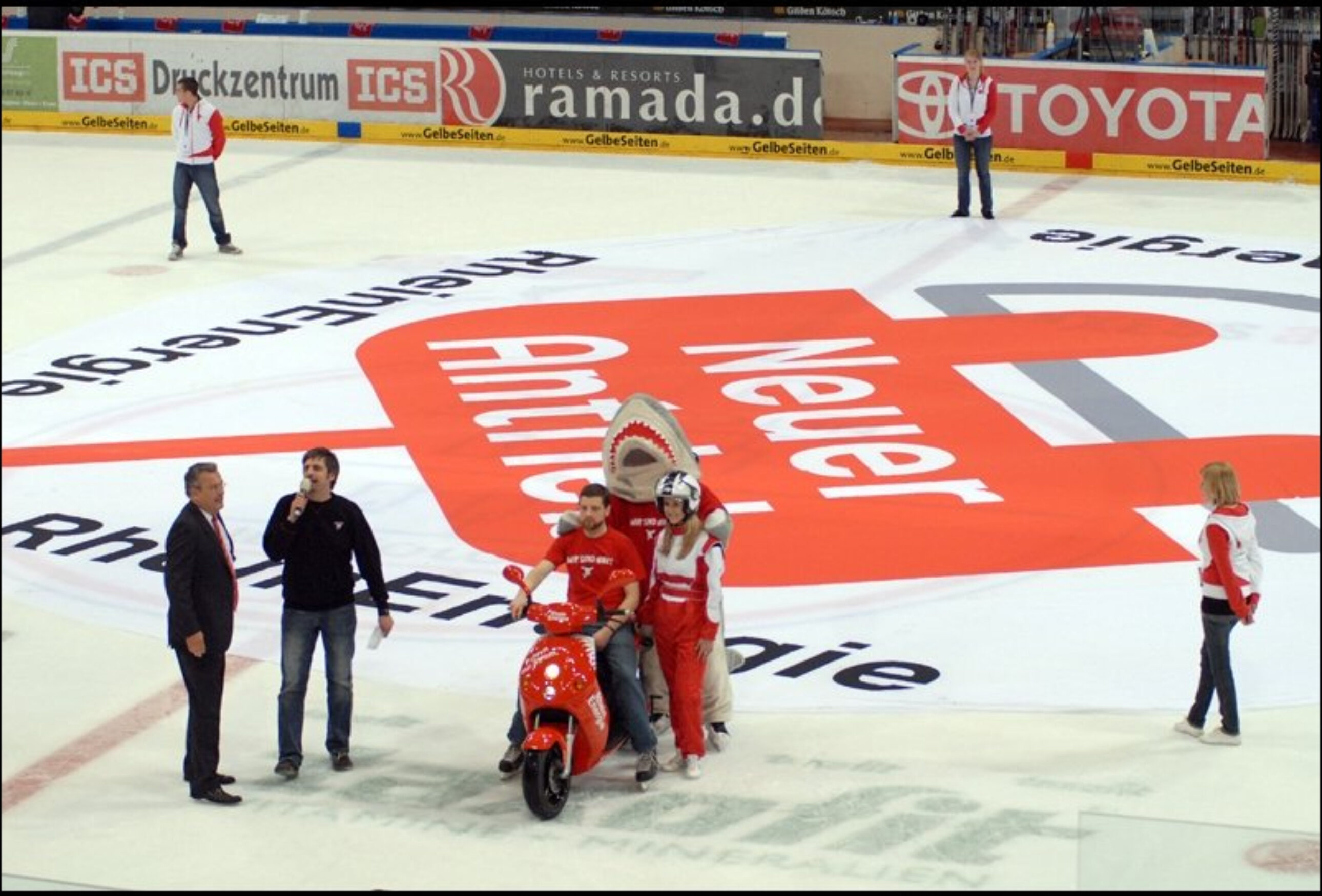Die RheinEnergie ist offizieller Präsentator der Haie-Play Offs 2010. Beim Heimspiel am Freitag gegen Ingolstadt war das groe Engagement des KEC-Partners erneut sicht- und hörbar. So verteilte die RheinEnergie Tausende von „clapsticks“, mit deren Hilfe die rund 10.000 Fans für eine tolle Play Off-Stimmung sorgten.