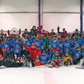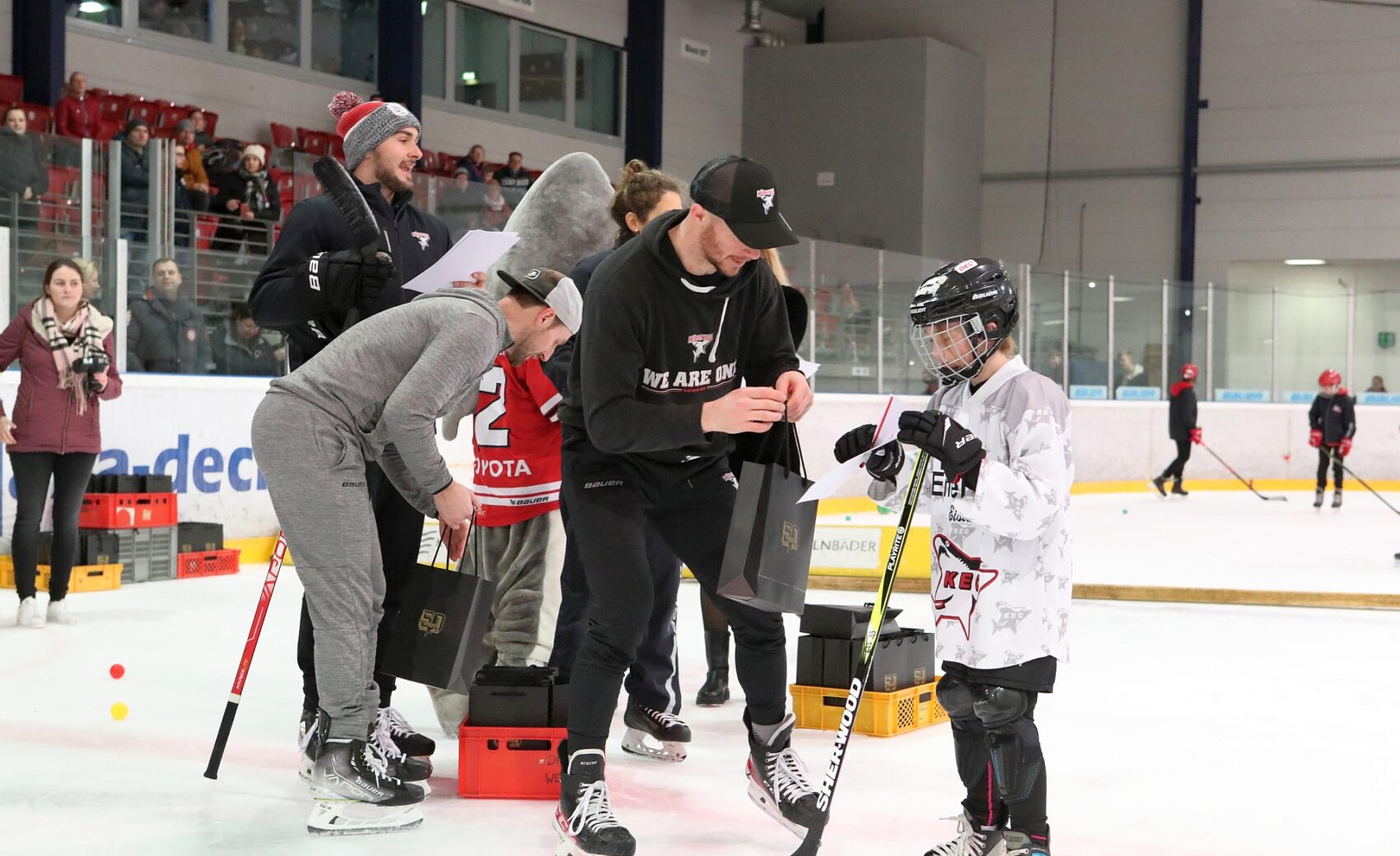 Nach einer anstrengenden Stunde auf dem Eis bekamen alle Kinder eine Urkunde und eine Haie-Tasche mit kleinen Geschenken von unseren Profis überreicht. Nass geschwitzt aber mit strahlenden Gesichtern verließen die Kids das Eis.