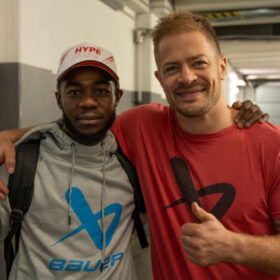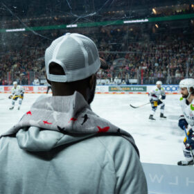 Neben seinen Besuchen der PENNY DEL-Spiele hatte Axali auch die Gelegenheit, selbst Eishockey zu spielen. Bei der zweiten Mannschaft des EHC Troisdorf Dynamite durfte der Namibianer mittrainieren und durch eine kurzfristige Erlaubnis des Eishockeyverbandes NRW auch an einem Vorbereitungsspiel teilnehmen – welches durch einen 6:3-Sieg für die Dynamites und Axali sportlich super lief. Für den 26-jährigen Namibianer eine unglaubliche Erfahrung. Von Namibia ins Haifischbecken – Geschichten, die unser Sport schreibt.