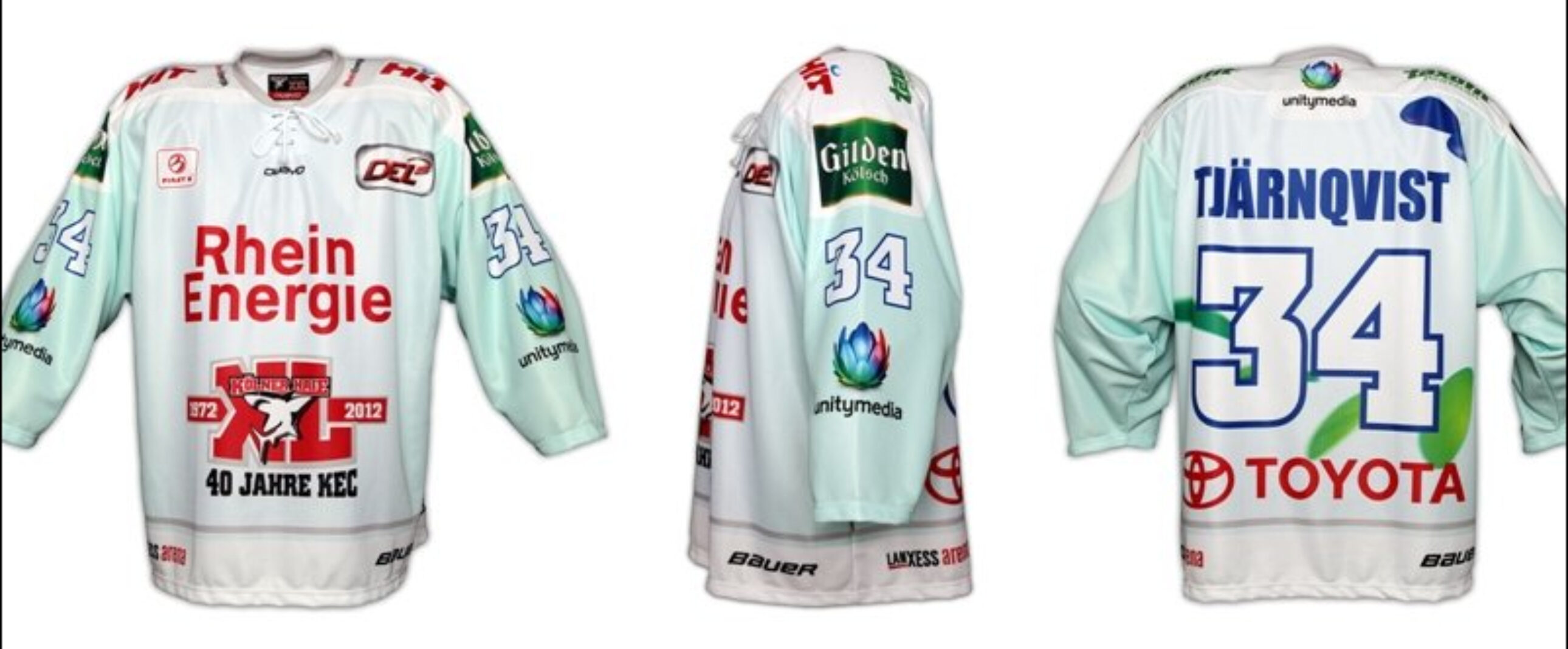 Zwei Mal klassisch, einmal auergewöhnlich. Zu Hause treten die Haie in der neuen Saison in Rot an, auswärts in Wei. Gemeinsam mit seinem Highspeed-Partner Unitymedia hat sich der KEC beim dritten Trikot – dem so genannten Ausweichtrikot – an eine etwas andere Palette ran gewagt. In den Farben des neuen Markenauftritts Unitymedias – in Grün- und Blautönen – ist das Sondertrikot mit dem Jubiläumslogo der Haie auf der Brust ein echter Hingucker. Das dritte Trikot ist ab Ende September erhältlich.